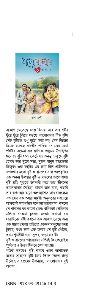 পাঠক হৃদয়েও বৃষ্টি নামবে এমন আশাতেই আষাঢ় শ্রাবণের বৃষ্টি নিয়ে তিলে তিলে গড়ে উঠেছে এ প্রেমের উপন্যাস, 'ভালোবাসার দুই অধ্যায়'।