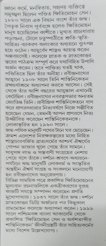 জ্ঞানে কর্মে, মনস্বিতায়, সহৃদয় ব্যক্তিত্বে সমুজ্জ্বল ছিলেন পণ্ডিত ক্ষিতিমোহন সেন। ১৮৮০ সালে এক বিদ্বান বংশে তাঁর জন্ম। পৈতৃক নিবাস পূর্ববঙ্গে হলেও ক্ষিতিমোহন মানুষ হয়েছিলেন কাশীতে। মুখ্যত প্রাচ্যধারায় পড়াশুনা, টোলে চতুষ্পাঠীতে শ্রুতি-স্মৃতি-সাহিত্য-ব্যাকরণ-অলংকার অধ্যয়নে ব্যুৎপন্ন হয়ে ওঠেন। আয়ুর্বেদ শাস্ত্রও আয়ত্ত করেন অল্পবয়সেই। কলেজে স্নাতক ও স্নাতকোত্তর স্তরের পাঠক্রম সম্পূর্ণ করে যথাবিহিত উপাধি অর্জন করেন। তবে পাণ্ডিত্য যতই থাক, পণ্ডিতিতে ছিল তাঁর অনীহা। রবীন্দ্রনাথের আহ্বানে ১৯০৮ সালে তিনি শান্তিনিকেতন ব্রহ্মহ্মচর্যাশ্রমে অধ্যাপনা করতে আসেন। সেই থেকে তাঁর আশি বছরের আয়ুষ্কাল এখানেই কেটেছিল। রবীন্দ্রনাথের নবরত্নসভার অন্যতম জ্যোতিষ্ক তিনি। রাবীন্দ্রিক শান্তিনিকেতনে বাস করে প্রাণরসধারার নিত্যবর্ষণে নিজে সঞ্জীবিত হয়েছেন যেমন, তেমনই আপন প্রাণরসে নিত্য উজ্জীবিত করেছেন শান্তিনিকেতনকে।