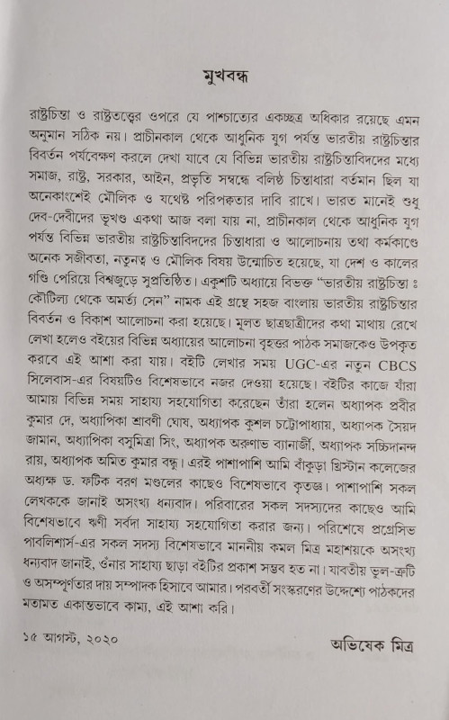 রাষ্ট্রচিন্তা ও রাষ্ট্রতত্ত্বের ওপরে যে পাশ্চাত্যের একচ্ছত্র অধিকার রয়েছে এমন অনুমান সঠিক নয়। প্রাচীনকাল থেকে আধুনিক যুগ পর্যন্ত ভারতীয় রাষ্ট্রচিন্তার বিবর্তন পর্যবেক্ষণ করলে দেখা যাবে যে বিভিন্ন ভারতীয় রাষ্ট্রচিন্তাবিদদের মধ্যে সমাজ, রাষ্ট্র, সরকার, আইন, প্রভৃতি সম্বন্ধে বলিষ্ঠ চিন্তাধারা বর্তমান ছিল যা অনেকাংশেই মৌলিক ও যথেষ্ট পরিপক্কতার দাবি রাখে। ভারত মানেই শুধু দেব-দেবীদের ভূখণ্ড একথা আজ বলা যায় না, প্রাচীনকাল থেকে আধুনিক যুগ পর্যন্ত বিভিন্ন ভারতীয় রাষ্ট্রচিন্তাবিদদের চিন্তাধারা ও আলোচনায় তথা কর্মকাণ্ডে অনেক সজীবতা, নতুনত্ব ও মৌলিক বিষয় উন্মোচিত হয়েছে, যা দেশ ও কালের গণ্ডি পেরিয়ে বিশ্বজুড়ে সুপ্রতিষ্ঠিত। একুশটি অধ্যায়ে বিভক্ত "ভারতীয় রাষ্ট্রচিন্তা: কৌটিল্য থেকে অমর্ত্য সেন" নামক এই গ্রন্থে সহজ বাংলায় ভারতীয় রাষ্ট্রচিন্তার বিবর্তন ও বিকাশ আলোচনা করা হয়েছে। মূলত ছাত্রছাত্রীদের কথা মাথায় রেখে লেখা হলেও বইয়ের বিভিন্ন অধ্যায়ের আলোচনা বৃহত্তর পাঠক সমাজকেও উপকৃত করবে এই আশা করা যায়। বইটি লেখার সময় UGC-এর নতুন CBCS সিলেবাস-এর বিষয়টিও বিশেষভাবে নজর দেওয়া হয়েছে। বইটির কাজে যাঁরা আমায় বিভিন্ন সময় সাহায্য সহযোগিতা করেছেন তাঁরা হলেন অধ্যাপক প্রবীর কুমার দে, অধ্যাপিকা শ্রাবণী ঘোষ, অধ্যাপক কুশল চট্টোপাধ্যায়, অধ্যাপক সৈয়দ জামান, অধ্যাপিকা বসুমিত্রা সিং, অধ্যাপক অরুণাভ ব্যানার্জী, অধ্যাপক সচ্চিদানন্দ রায়, অধ্যাপক অমিত কুমার বন্ধু। এরই পাশাপাশি আমি বাঁকুড়া খ্রিস্টান কলেজের অধ্যক্ষ ড. ফটিক বরণ মণ্ডলের কাছেও বিশেষভাবে কৃতজ্ঞ। পাশাপাশি সকল লেখককে জানাই অসংখ্য ধন্যবাদ। পরিবারের সকল সদস্যদের কাছেও আমি বিশেষভাবে ঋণী সর্বদা সাহায্য সহযোগিতা করার জন্য। পরিশেষে প্রগ্রেসিভপাবলিশার্স-এর সকল সদস্য বিশেষভাবে মাননীয় কমল মিত্র মহাশয়কে অসংখ্য ধন্যবাদ জানাই, ওঁনার সাহায্য ছাড়া বইটির প্রকাশ সম্ভব হত না। যাবতীয় ভুল-ত্রুটি ও অসম্পূর্ণতার দায় সম্পাদক হিসাবে আমার। পরবর্তী সংস্করণের উদ্দেশ্যে পাঠকদের মতামত একান্তভাবে কাম্য, এই আশা করি।