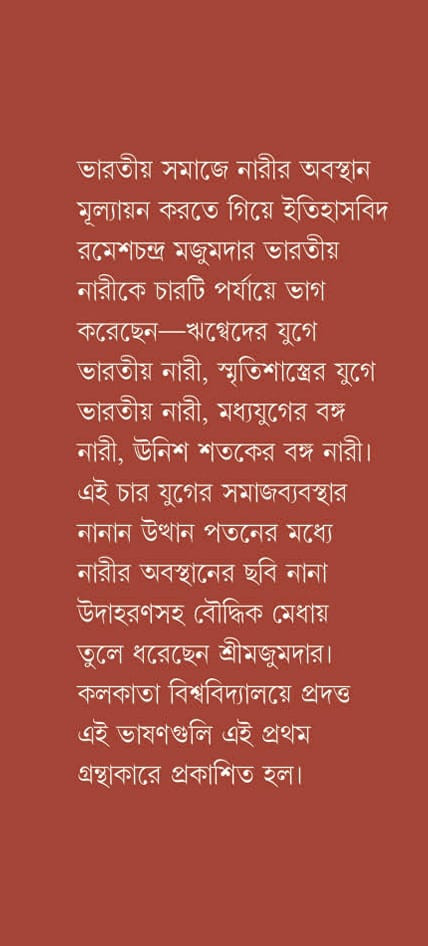 ভারতীয় সমাজে নারীর অবস্থান মূল্যায়ন করতে গিয়ে ইতিহাসবিদ রমেশচন্দ্র মজুমদার ভারতীয় নারীকে চারটি পর্যায়ে ভাগ করেছেন-ঋগ্বেদের যুগে ভারতীয় নারী, স্মৃতিশাস্ত্রের যুগে ভারতীয় নারী, মধ্যযুগের বঙ্গ নারী, ঊনিশ শতকের বঙ্গ নারী। এই চার যুগের সমাজব্যবস্থার নানান উত্থান পতনের মধ্যে নারীর অবস্থানের ছবি নানা উদাহরণসহ বৌদ্ধিক মেধায় তুলে ধরেছেন শ্রীমজুমদার। কলকাতা বিশ্ববিদ্যালয়ে প্রদত্ত এই ভাষণগুলি এই প্রথম গ্রন্থাকারে প্রকাশিত হল।