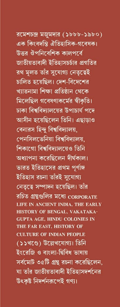 রমেশচন্দ্র মজুমদার (১৮৮৮-১৯৮০) এক কিংবদন্তি ঐতিহাসিক-গবেষক। উত্তর ঔপনিবেশিক কালপর্বে জাতীয়তাবাদী ইতিহাসচর্চার প্রগতির রথ মূলত তাঁর সুযোগ্য নেতৃত্বেই চালিত হয়েছিল। দেশ-বিদেশের খ্যাতনামা শিক্ষা প্রতিষ্ঠান থেকে মিলেছিল গবেষণাকর্মের স্বীকৃতি। ঢাকা বিশ্ববিদ্যালয়ের উপাচার্য পদে আসীন হয়েছিলেন তিনি। এছাড়াও বেনারস হিন্দু বিশ্ববিদ্যালয়, পেনসিলভেনিয়া বিশ্ববিদ্যালয়, শিকাগো বিশ্ববিদ্যালয়েও তিনি অধ্যাপনা করেছিলেন দীর্ঘকাল। ভারত ইতিহাসের প্রথম পূর্ণাঙ্গ ইতিহাস রচনা তাঁরই সুযোগ্য নেতৃত্বে সম্পাদন হয়েছিল। তাঁর রচিত গ্রন্থগুলির মধ্যে CORPORATE LIFE IN ANCIENT INDIA, THE EARLY HISTORY OF BENGAL, VAKATAKA- GUPTA AGE, HINDU COLONIES IN THE FAR EAST, HISTORY OF CULTURE OF INDIAN PEOPLE (১১খণ্ডে) উল্লেখযোগ্য। তিনি ইংরেজি ও বাংলা-দ্বিবিধ ভাষায় সর্বমোট ৩৫টি গ্রন্থ রচনা করেছিলেন, যা তাঁর জাতীয়তাবাদী ইতিহাসদর্শনের উৎকৃষ্ট নিদর্শনরূপেই গণ্য।