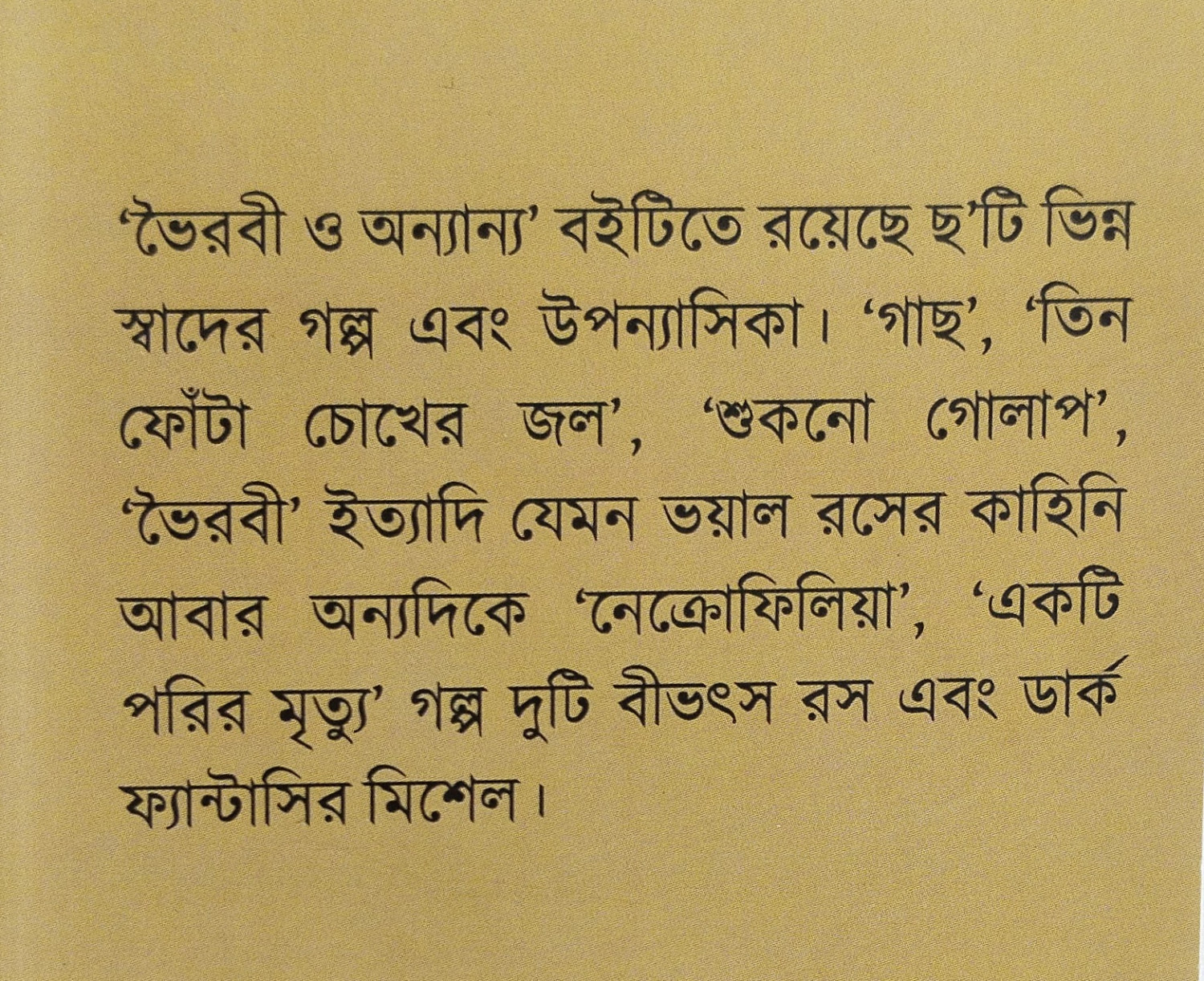 ‘ভৈরবী ও অন্যান্য’ বইটিতে রয়েছে ছ’টি ভিন্ন স্বাদের গল্প এবং উপন্যাসিকা। ‘গাছ’, ‘তিন ফোঁটা চোখের জল’, ‘শুকনো গোলাপ’, ‘ভৈরবী’ ইত্যাদি যেমন ভয়াল রসের কাহিনি আবার অন্যদিকে নেক্রোফিলিয়া, ‘একটি পরির মৃত্যু’ গল্প দুটি বীভৎস রস এবং ডার্ক ফ্যান্টাসির মিশেল।