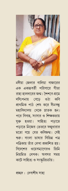নদীয়া জেলার বালিয়া বাজারের এক একান্নবর্তী পরিবারে গীতা রাহা হালদারের জন্ম। শৈশবে গ্রামে দস্যিপনায় বেড়ে ওঠা কবি প্রাথমিক পাঠ শেষ করে দীনবন্ধু মহাবিদ্যালয় থেকে স্নাতক হন। পরে বিবাহ, সংসার ও শিক্ষকতায় যুক্ত হওয়া। সাহিত্য পড়াতে পড়াতে নিজের ভেতরে ফল্গুধারার মতো বয়ে যেত কবিজন্ম। সেই শুরু। বাংলা ভাষার বিভিন্ন পত্র পত্রিকায় তাঁর লেখা প্রকাশিত হয়। বিদেশের ওয়েবম্যাগেরও তিনি নিয়মিত লেখক। অবসর সময় কাটে সাহিত্য ও সংস্কৃতিচর্চায়।
