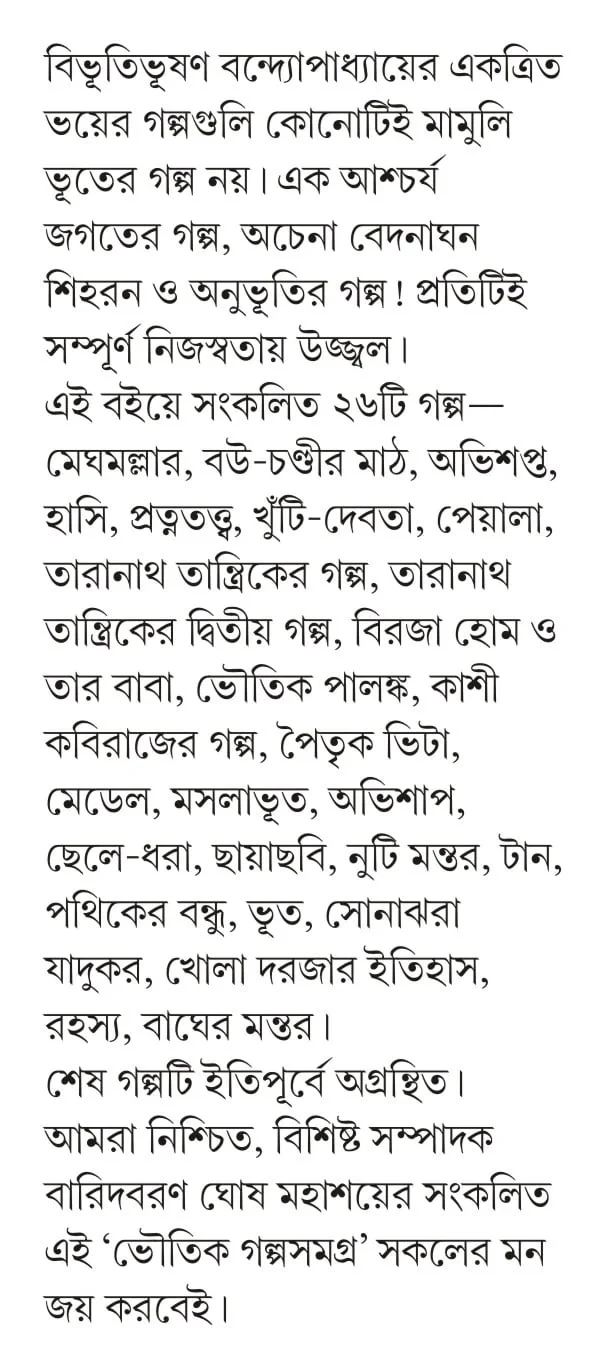 বিভূতিভূষণ বন্দ্যোপাধ্যায়ের একত্রিত ভয়ের গল্পগুলি কোনোটিই মামুলি ভূতের গল্প নয় ৷ এক আশ্চর্য জগতের গল্প, অচেনা বেদনাঘন শিহরন ও অনুভূতির গল্প ! প্রতিটিই সম্পূর্ণ নিজস্বতায় উজ্জ্বল ৷