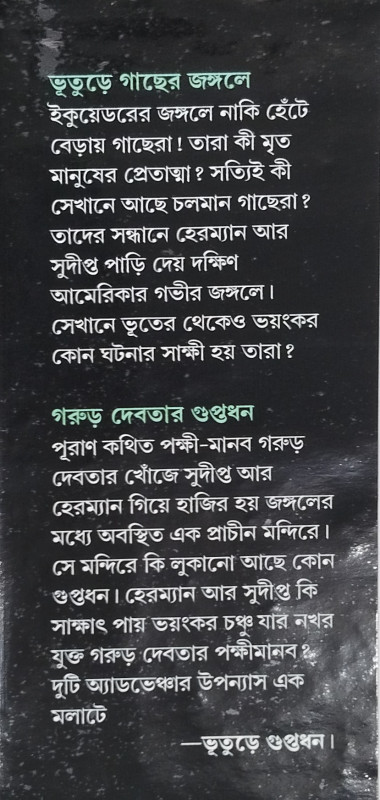 পূরাণ কথিত পক্ষী-মানব গরুড় দেবতার খোঁজে সুদীপ্ত আর হেরম্যান গিয়ে হাজির হয় জঙ্গলের মধ্যে অবস্থিত এক প্রাচীন মন্দিরে। সে মন্দিরে কি লুকানো আছে কোন গুপ্তধন। হেরম্যান আর সুদীপ্ত কি সাক্ষাৎ পায় ভয়ংকর চঞ্চু যার নখর যুক্ত গরুড় দেবতার পক্ষীমানব? দুটি অ্যাডভেঞ্চার উপন্যাস এক মলাটে