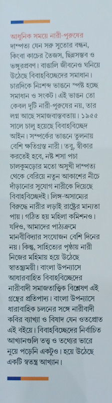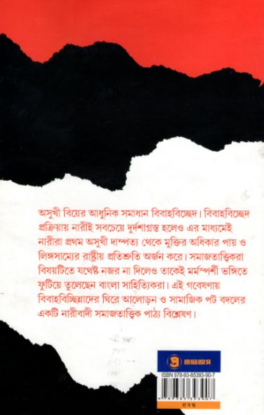 আধুনিক সময়ে নারী-পুরুষের দাম্পত্য যেন সরু সুতোর বন্ধন, কিংবা কাচের তৈজস, ছিন্নসম্ভব ও ভঙ্গুরপ্রবণ। বাঙালি জীবনেও ঘনিয়ে উঠেছে বিবাহবিচ্ছেদের সমাধান। চারদিকে নিঃশব্দ ভাঙনে স্পষ্ট হচ্ছে সমাধান ও সংকট। এই ভাঙন তো কেবল দুটি নারী-পুরুষের নয়, তার লগ্ন আছে সমাজবাস্তবতায়। ১৯৫৫ সালে চালু হয়েছে বিবাহবিচ্ছেদ আইন। সম্পর্কের ভাঙনে তুলনায় বেশি ক্ষতিগ্রস্ত নারী। তবু, স্বীকার করতেই হবে, নষ্ট শসা পচা চালকুমড়োর মতো অসুখী দাম্পত্য থেকে বেরিয়ে নতুন আকাশের নীচে দাঁড়ানোর সুযোগ নারীকে দিয়েছে বিবাহবিচ্ছেদই। লিঙ্গ-অসাম্যের বিরুদ্ধে নারীর লড়াই রাষ্ট্রের মান্যতা পায়। গঠিত হয় মহিলা কমিশনও। যদিও, আমাদের পাঠ্যক্রমে মানবীবিদ্যার সংযোজন বেশি দিনের নয়। কিন্তু, সাহিত্যের পৃষ্ঠায় নারী নিজের মহিমায় হয়ে উঠেছে স্বাতন্ত্র্যময়ী। বাংলা উপন্যাসে আধারবাহিত বিবাহবিচ্ছেদের নারীবাদী সমাজতাত্ত্বিক বিশ্লেষণ এইগ্রন্থের প্রতিপাদ্য। বাংলা উপন্যাসে ধারাবাহিক চলনের সঙ্গে নারীবাদী কবির ব্যাখ্যা ও বিষাদ যেন ওতপ্রোত এই বইয়ে। বিবাহবিচ্ছেদের নির্বাচিত আখ্যানগুলি তত্ত্ব ও তথ্যের ভারে নুয়ে পড়েনি একটুও। হয়ে উঠেছে একটি স্বতন্ত্র আখ্যান।