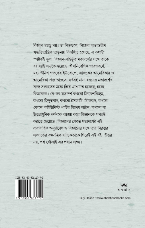বিজ্ঞান স্বয়ম্ভু নয়। তা নিজগুণে, নিজের অভ্যন্তরীণ পদ্ধতিতান্ত্রিক তাড়নায় বিকশিত হয়েছে, এ কথাটা স্পষ্টতই ভুল। বিজ্ঞান-বহির্ভূত মতাদর্শের সঙ্গে তাকে বরাবরই লড়তে হয়েছে। ঔপনিবেশিক ভারতবর্ষে, মধ্য-উনিশ শতকের ইউরোপে, আজকের আমেরিকায় ও আমেরিকা-গ্রস্ত ভারতে, সর্বত্রই নানা ধরনের মতাদর্শের সঙ্গে সংঘাতের মধ্যে দিয়ে এগোতে হয়েছে, হচ্ছে বিজ্ঞানকে। সে-সব মতাদর্শ কখনো ক্রিয়েশনিজম, কখনো হিন্দুত্ববাদ, কখনো ইসলামি মৌলবাদ, কখনো কোনো কমিউনিস্ট পার্টির বিশেষ লাইন, কখনো বা উত্তরাধুনিক দর্শনকে আশ্রয় করে বিজ্ঞানকে পথভ্রষ্ট করতে চেয়েছে। বিজ্ঞানের ক্ষেত্রে মতাদর্শের এই ধারাবাহিক অনুপ্রবেশ ও বিজ্ঞানের সঙ্গে তার নিরন্তর সংঘাতের বহুমাত্রিক দ্বান্দ্বিকতাকে ঘিরেই এই বই। উত্তর নয়, প্রশ্ন খোঁজাই এর প্রধান লক্ষ্য।