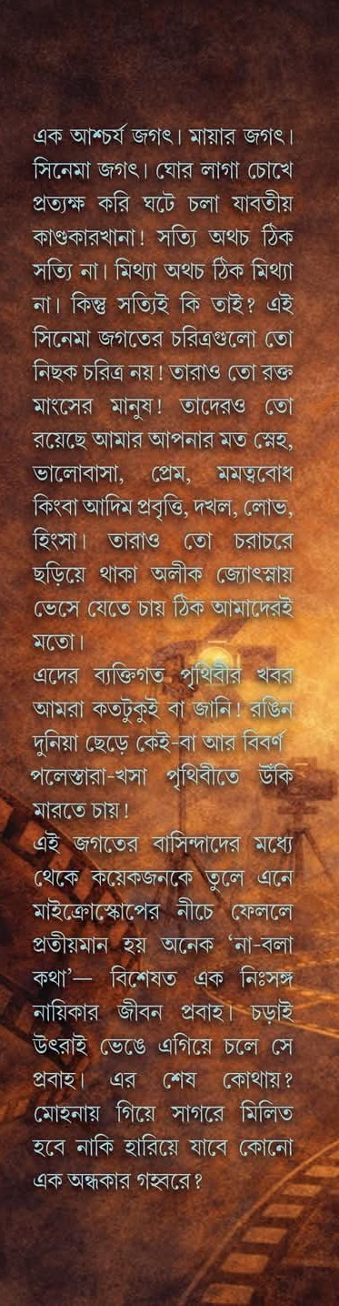 এক আশ্চর্য জগৎ। মায়ার জগৎ। সিনেমা জগৎ। ঘোর লাগা চোখে প্রত্যক্ষ করি ঘটে চলা যাবতীয় কাণ্ডকারখানা! সত্যি অথচ ঠিক সত্যি না। মিথ্যা অথচ ঠিক মিথ্যা না। কিন্তু সত্যিই কি তাই? এই সিনেমা জগতের চরিত্রগুলো তো নিছক চরিত্র নয়! তারাও তো রক্ত মাংসের মানুষ! তাদেরও তো রয়েছে আমার আপনার মত স্নেহ, ভালোবাসা, প্রেম, মমত্ববোধ কিংবা আদিম প্রবৃত্তি, দখল, লোভ, হিংসা। তারাও তো চরাচরে ছড়িয়ে থাকা অলীক জ্যোৎস্নায় ভেসে যেতে চায় ঠিক আমাদেরই মতো।