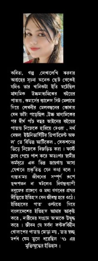 কবিতা, গল্প লেখালেখি করবার আগ্রহের সূচনা অনেক ছোট থেকেই যদিও তার খানিকটা ইতি ঘটেছিল মাধ্যমিক উচ্চমাধ্যমিকের বইয়ের পাতায়, কমার্সের ব্যালেন্স সিট মেলাতে গিয়ে লেখনীর মেলবন্ধনের কোথায় যেন ভাঁটা পড়েছিল, উচ্চ মাধ্যমিকের পর দীর্ঘ পাঁচ বছর আইনের বইয়ের পাতায় নিজেকে হারিয়ে দেওয়া, নর্থ বেঙ্গল ইউনিভার্সিটির ডিপার্টমেন্ট অফ ল' তে বিভিন্ন আর্টিকেল, সেকশনের ভিড়ে নিজেকে বিজড়িত করা। ফার্স্ট ক্লাস পেয়ে পাশ করে অতঃপর স্বামীর কর্মসূত্রে এক ভিন্ন জায়গায় আসা যেখানে প্রকৃতিত্ত যেন কথা বলে। ব্যস্ততাময় জীবনের সম্পূর্ণ রূপে ছন্দপতন না ঘটলেও দিগন্তব্যাপী সবুজের প্রাঙ্গণে ও মধ্য গগনের প্রখর দীপ্তিতে ইতিহাস যেন জীবন্ত হয়ে ওঠে। ইতিহাসের পাতা ওল্টাতে গিয়ে বাংলাদেশের ইতিহাস আমায় আকৃষ্ট করে, নারীদের সংগ্রাম আমাকে উদ্বুদ্ধ করে। জীবন যে সর্বদা কন্টকবিহীন গোলাপের পাতায় মোড়া নয়, তার স্বচ্ছ দর্পণ যেন তুলে ধরেছিল '৭১ এর মুক্তিযুদ্ধের ইতিহাস।