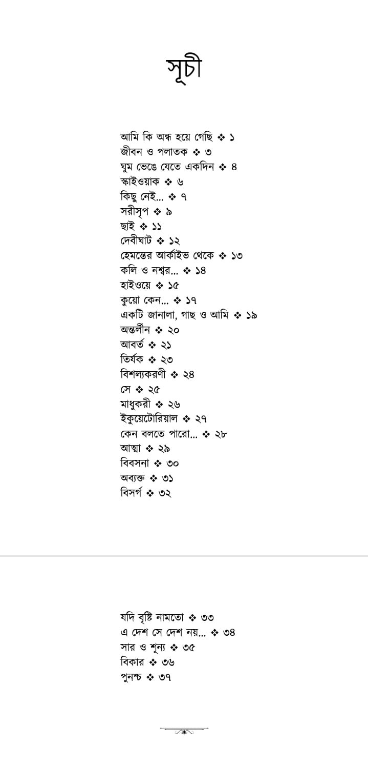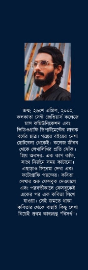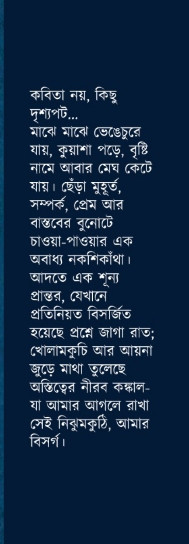 মাঝে মাঝে ভেঙেচুরে যায়, কুয়াশা পড়ে, বৃষ্টি নামে আবার মেঘ কেটে যায়। ছেঁড়া মুহূর্ত, সম্পর্ক, প্রেম আর বাস্তবের বুনোটে চাওয়া-পাওয়ার এক অবাধ্য নকশিকাঁথা। আদতে এক শূন্য প্রান্তর, যেখানে প্রতিনিয়ত বিসর্জিত হয়েছে প্রশ্নে জাগা রাত; খোলামকুচি আর আয়না জুড়ে মাথা তুলেছে অস্তিত্বের নীরব কঙ্কাল- যা আমার আগলে রাখা সেই নিঝুমকুঠি, আমার বিসর্গ।