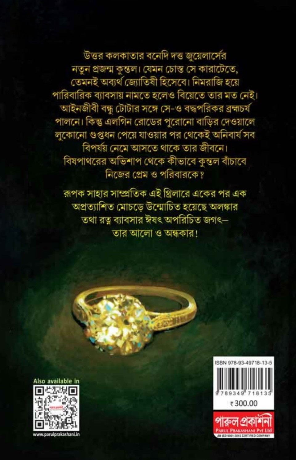 রূপক সাহার সাম্প্রতিক এই থ্রিলারে একের পর এক অপ্রত্যাশিত মোচড়ে উন্মোচিত হয়েছে অলঙ্কার তথা রত্ন ব্যাবসার ঈষৎ অপরিচিত জগৎ – তার আলো ও অন্ধকার!