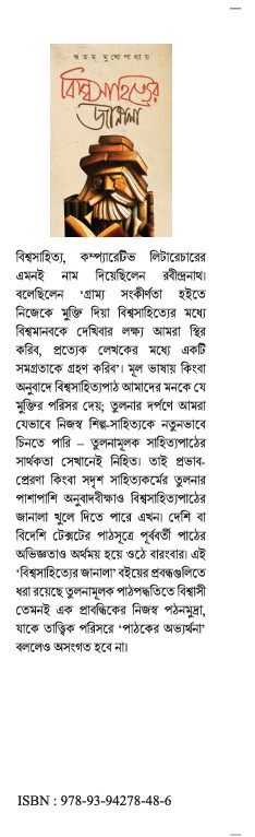 বিশ্বসাহিত্য, কম্প্যারেটিভ লিটারেচারের এমনই নাম দিয়েছিলেন রবীন্দ্রনাথ। বলেছিলেন 'গ্রাম্য সংকীর্ণতা হইতে নিজেকে মুক্তি দিয়া বিশ্বসাহিত্যের মধ্যে বিশ্বমানবকে দেখিবার লক্ষ্য আমরা স্থির করিব, প্রত্যেক লেখকের মধ্যে একটি সমগ্রতাকে গ্রহণ করিব'। মূল ভাষায় কিংবা অনুবাদে বিশ্বসাহিত্যপাঠ আমাদের মনকে যে মুক্তির পরিসর দেয়; তুলনার দর্পণে আমরা যেভাবে নিজস্ব শিল্প-সাহিত্যকে নতুনভাবে চিনতে পারি তুলনামূলক সাহিত্যপাঠের সার্থকতা সেখানেই নিহিত। তাই প্রভাব-প্রেরণা কিংবা সদৃশ সাহিত্যকর্মের তুলনার পাশাপাশি অনুবাদবীক্ষাও বিশ্বসাহিত্যপাঠের জানালা খুলে দিতে পারে এখন। দেশি বা বিদেশি টেক্সটের পাঠসূত্রে পূর্ববর্তী পাঠের অভিজ্ঞতাও অর্থময় হয়ে ওঠে বারংবার। এই 'বিশ্বসাহিত্যের জানালা' বইয়ের প্রবন্ধগুলিতে ধরা রয়েছে তুলনামূলক পাঠপদ্ধতিতে বিশ্বাসী তেমনই এক প্রাবন্ধিকের নিজস্ব পঠনমুদ্রা, যাকে তাত্ত্বিক পরিসরে 'পাঠকের অভ্যর্থনা' বললেও অসংগত হবে না।