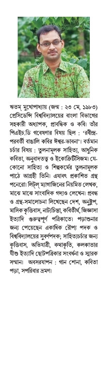 ঋতম্ মুখোপাধ্যায় (জন্ম: ২৩ মে, ১৯৮৩) প্রেসিডেন্সি বিশ্ববিদ্যালয়ের বাংলা বিভাগের সহকারী অধ্যাপক, প্রাবন্ধিক ও কবি। তাঁর পিএইচ.ডি গবেষণার বিষয় ছিল: 'রবীন্দ্র-পরবর্তী বাঙালি কবির ঈশ্বর-ভাবনা'। বর্তমান চর্চার বিষয়: তুলনামূলক সাহিত্য, আধুনিক কবিতা, অনুবাদতত্ত্ব ও ইকোক্রিটিসিজম। যে-কোনো সাহিত্য ও শিল্পকর্মের তুলনামূলক পাঠে আগ্রহী তিনি। এযাবৎ প্রকাশিত গ্রন্থ পনেরো। লিটল্ ম্যাগাজিনের নিয়মিত লেখক, মাঝে মাঝে সাংবাদিক গদ্যও লেখেন। প্রবন্ধ ও গ্রন্থ-সমালোচনা লিখেছেন দেশ, অনুষ্টুপ, মাসিক কৃত্তিবাস, নাট্যচিন্তা, কবিতীর্থ, জিজ্ঞাসা ইত্যাদি গুরুত্বপূর্ণ পত্রিকাতে। পড়াশুনার জন্য পেয়েছেন একাধিক রৌপ্য পদক ও বিশ্ববিদ্যালয়ের সুবর্ণপদক; সাহিত্যচর্চার জন্য কৃত্তিবাস, অভিযাত্রী, কথাকৃতি, কলকাতার যীশু ইত্যাদি ছোটপত্রিকার সংবর্ধনা ও স্মারক সম্মান। অবসরযাপন: গান শোনা, কবিতা পড়া, সপরিবার ভ্রমণ।