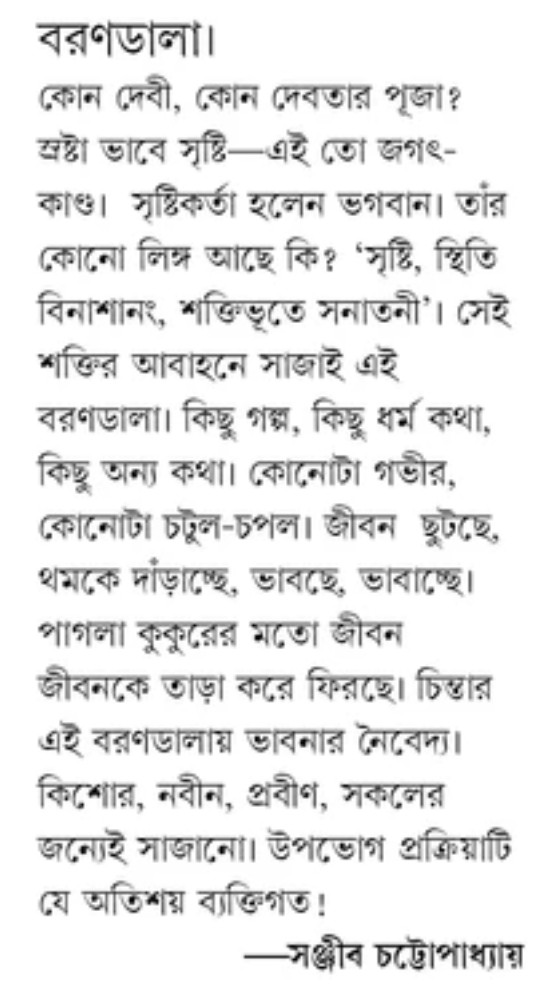 কোন দেবী, কোন দেবতার পূজা? স্রষ্টা ভাবে সৃষ্টি-এই তো জগৎ-কাণ্ড। সৃষ্টিকর্তা হলেন ভগবান। তাঁর কোনো লিঙ্গ আছে কি? 'সৃষ্টি, স্থিতি বিনাশানং, শক্তিভূতে সনাতনী'। সেই শক্তির আবাহনে সাজাই এই বরণডালা। কিছু গল্প, কিছু ধর্ম কথা, কিছু অন্য কথা। কোনোটা গভীর, কোনোটা চটুল-চপল। জীবন ছুটছে, থমকে দাঁড়াচ্ছে, ভাবছে, ভাবাচ্ছে। পাগলা কুকুরের মতো জীবন জীবনকে তাড়া করে ফিরছে। চিন্তার এই বরণডালায় ভাবনার নৈবেদ্য। কিশোর, নবীন, প্রবীণ, সকলের জন্যেই সাজানো। উপভোগ প্রক্রিয়াটি যে অতিশয় ব্যক্তিগত!