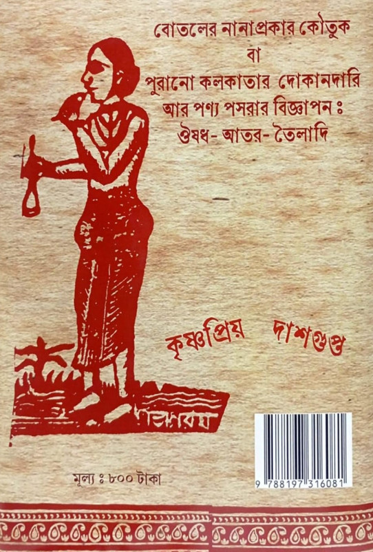 কলকাতাকে নিয়ে কাজের শেষ নেই। কলকাতাকে জানারও শেষ নেই। এই বইয়ে লেখক কৃষ্ণপ্রিয় দাশগুপ্ত উনিশ শতকের কলকাতায় দোকানদারি আর পণ্য পসরার বিজ্ঞাপন কেমন ছিল তা-ই জানিয়েছেন। ১৮৯০ থেকে ১৯৩০ সালের মধ্যবর্তী সময়ের সংশ্লিষ্ট বিবরণ স্থান পেয়েছে এই বইয়ে। তখনকার সমাজ,স্বাস্থ্য, যৌনতা, লেখাপড়া, শ্লীলতা-অশ্লীলতা এবং স্বামী-স্ত্রী’র সম্পর্ক— ইত্যাদি বিষয়ের নিরিখে বিজ্ঞাপন এবং পণ্য পসরাকে দেখা হয়েছে এই বইয়ে। সামাজিক অবস্থা এবং তার পরিপ্রেক্ষিতে কীভাবে বিজ্ঞাপন দিয়ে ‘ঔষধ-আতর-তৈলাদি'র কারবার চলেছে, তারই এক কৌতুকপ্রদ বিবরণ রয়েছে বইয়ের মধ্যে।