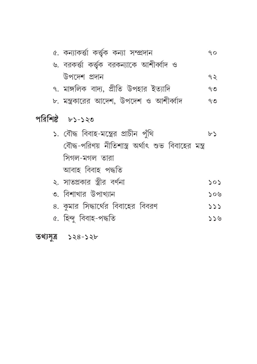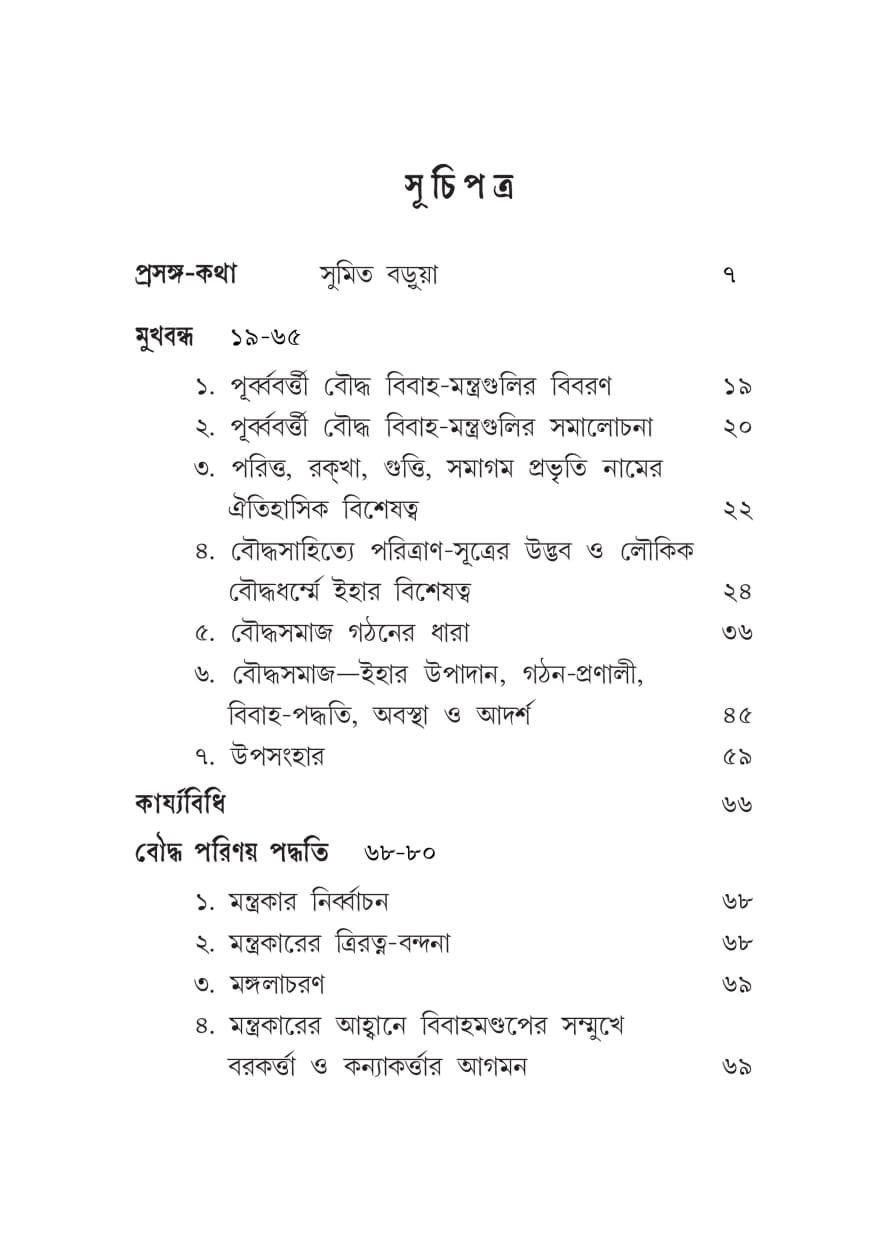 আচার্য বেণীমাধব বড়ুয়া রচিত বৌদ্ধ পরিণয়-পদ্ধতি (১৯২২) গ্রন্থে বৌদ্ধ পরিণয়মন্ত্র সংকলনের সঙ্গে সঙ্গে পরিণয়-পদ্ধতির বর্ণনা ও ভাষ্য উপস্থাপিত হয়েছে। গ্রন্থের ‘মুখবন্ধ’-এ পূর্ববর্তী বৌদ্ধ পরিণয়মন্ত্রগুলির বিবরণ ও সমালোচনা; বৌদ্ধসাহিত্যে পরিত্রাণ সূত্রের উদ্ভব ও লৌকিক ও ঐতিহাসিক বৌদ্ধধর্মে এর বিশেষত্ব; বৌদ্ধসমাজ গঠনের ধারার উপাদান, গঠন-প্রণালী, বিবাহ-পদ্ধতি, অবস্থা ও আদর্শ সম্পর্কে বিস্তারিত আলোচনা রয়েছে। ‘পরিশিষ্ট’ অংশে বৌদ্ধ পরিণয়ের অপ্রকাশিত প্রাচীন পুঁথি, বৌদ্ধ পরিণয় নীতিশাস্ত্র ও সিগল-মগল তারা থেকে মন্ত্র সংকলন, সাতপ্রকার স্ত্রীর বর্ণনা, বিশাখার উপাখ্যান, সিদ্ধার্থ-গোপার পরিণয় বর্ণনা ও হিন্দু পরিণয় পদ্ধতির সংক্ষিপ্ত বিবরণ রয়েছে। বাঙালি বৌদ্ধসমাজের সামাজিক বিবর্তনের সমাজতাত্ত্বিক ধারার চর্চায় এই গ্রন্থটি দূরযানী আকরগ্রন্থের মর্যাদার অধিকারী।
