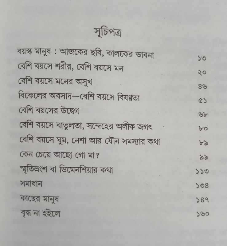 মানুষের আয়ুবৃদ্ধির সাথে সাথে সমস্যাও বাড়ছে। আজকের দিনে বয়স্ক মানুষের অন্ততঃ এক চতুর্থাংশ স্মৃতির সমস্যা, অবসাদ, উদ্বেগ এমন অনেক সমস্যায় কষ্ট পাচ্ছেন। কাছের মানুষ, পরিবার পরিজনেও সমাধানের দিশা খুঁজে না পেয়ে এক্ষেত্রে অসহায়। গুরুত্বপূর্ণ এমন কিছু বিষয়ের আলোচনা সমৃদ্ধ ‘বয়সকালে মনের অসুখ’ বইটি হয়ত এই সংকটে কিছুটা পথ দেখাতে পারে।