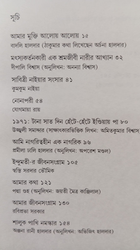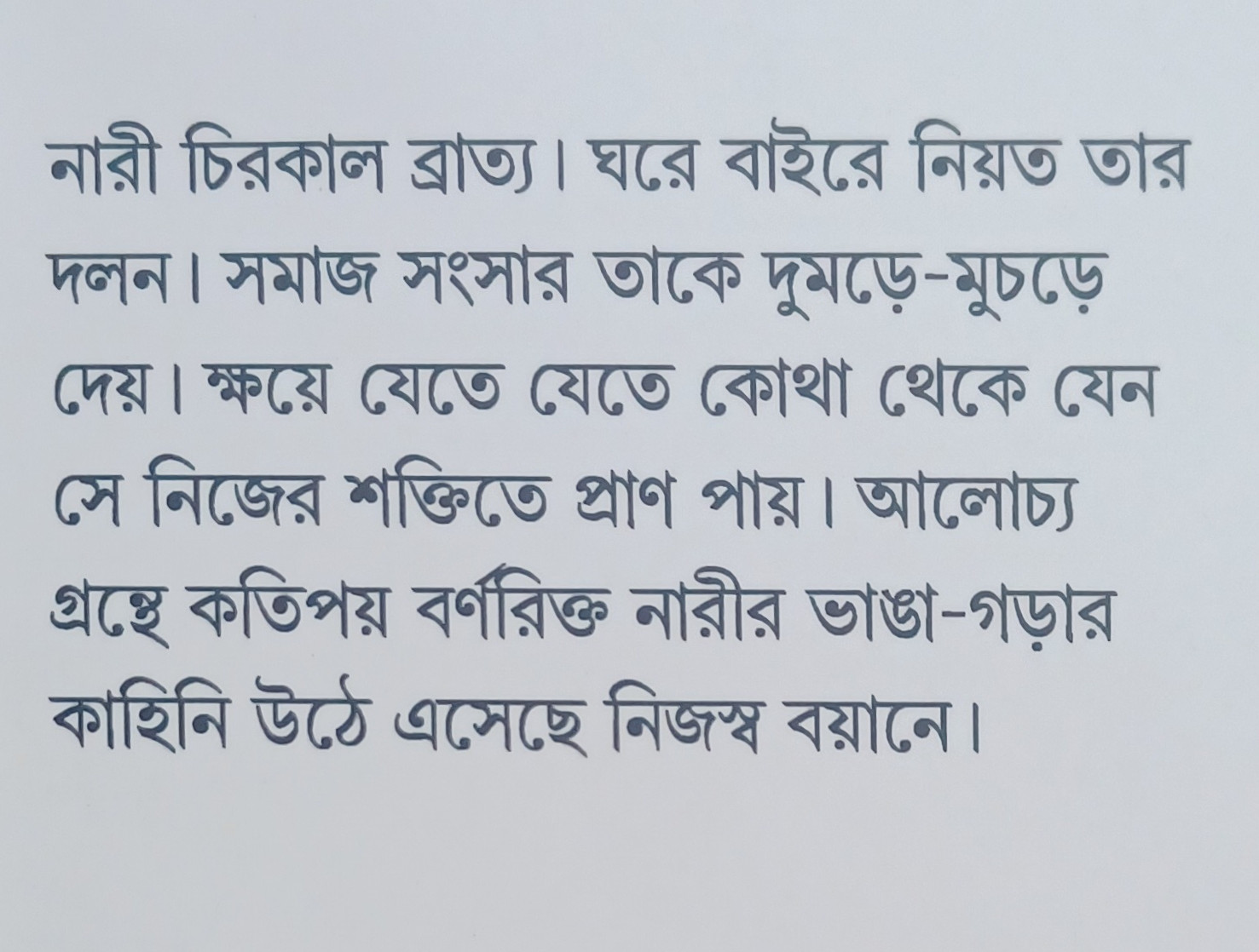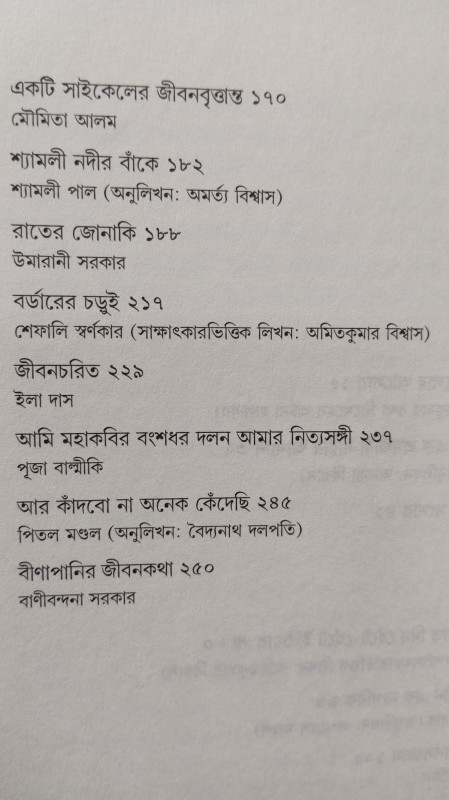 নারী চিরকাল ব্রাত্য। ঘরে বাইরে নিয়ত তার দলন। সমাজ সংসার তাকে দুমড়ে-মুচড়ে দেয়। ক্ষয়ে যেতে যেতে কোথা থেকে যেন সে নিজের শক্তিতে প্রাণ পায়। আলোচ্য গ্রন্থে কতিপয় বর্ণরিক্ত নারীর ভাঙা-গড়ার কাহিনি উঠে এসেছে নিজস্ব বয়ানে।