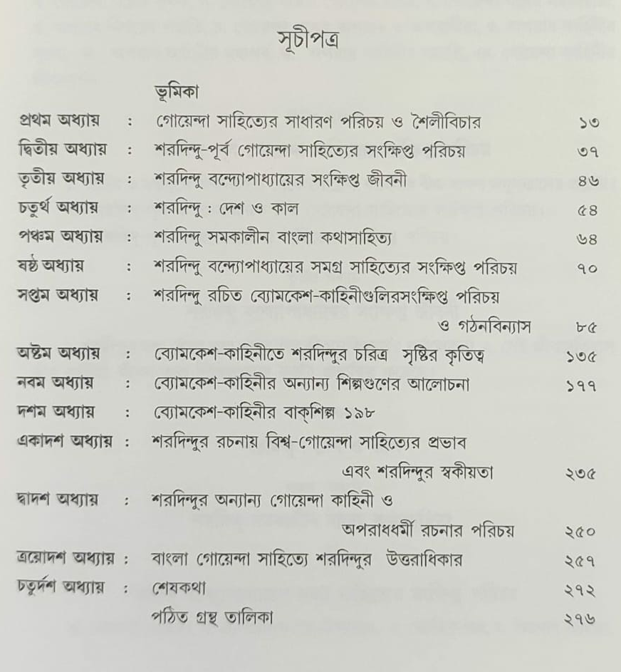 গ্রন্থটি মূলত ব্যোমকেশকেন্দ্রিক গোয়েন্দা গল্পগুলি সম্পর্কে একটি আলোচনা গ্রন্থ। ফলে ব্যোমকেশকাহিনীর গঠনশৈলী, চরিত্র অন্বেষণ, ভাষাশৈলী, রচনাগুলির সঙ্গে বিদেশি কাহিনীর সামঞ্জস্য, শরদিন্দুর মৌলিক প্রভাব প্রভৃতি নানা বিষয় আলোচ্য গ্রন্থে স্থান পেয়েছে। এছাড়া লেখক গ্রন্থের গোড়ায় গোয়েন্দা গল্পের রচনার একটি সূত্র তৈরী করেছেন এবং বাংলা গোয়েন্দা সাহিত্যের একটি সংক্ষিপ্ত ইতিহাসও দিয়েছেন যার মধ্যে প্রিয়নাথ মুখোপাধ্যায়, পাঁচকড়ি দে, দীনেন্দ্রকুমার রায়, মৃত্যুঞ্জয় চট্টোপাধ্যায়, হেমেন্দ্রকুমার রায় প্রমুখ শরদিন্দুর পূর্বসূরীরা তো আছেনই সেইসঙ্গে নীহাররঞ্জন গুপ্ত, সত্যজিৎ রায়, সুনীল গঙ্গোপাধ্যায়, সমরেশ বসু, নীরেন্দ্রনাথ চক্রবর্তী, সৈয়দ মুস্তাফা সিরাজ, নারায়ণ সান্যাল, বুদ্ধদেব গুহ, শীর্ষেন্দু মুখোপাধ্যায়, অদ্রীশ বর্ধন, হর্ষ দত্ত, সুচিত্রা মিত্র প্রমুখের মতো উত্তরসূরীদের সম্পর্কেও আলোচনা রয়েছে।