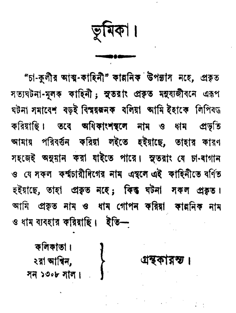 “চা-কুলীর আত্মকাহিনী” কাল্পনিক উপন্যাস নহে, প্রকৃত সত্যঘটনা-মূলক কাহিনী; সুতরাং প্রকৃত মনুষ্যজীবনে এরূপ ঘটনা সমাবেশ বড়ই বিস্ময়জনক বলিয়া আমি ইহাকে লিপিবদ্ধ করিয়াছি। তবে অধিকাংশস্থলে নাম ও ধাম প্রভৃতি আমায় পরিবর্ত্তন করিয়া লইতে হইয়াছে, তাহার কারণ সহজেই অনুমান করা যাইতে পারে। সুতরাং যে চা-বাগান ও যে সকল কর্ম্মচারীদিগের নাম এস্থলে এই কাহিনীতে বর্ণিত হইয়াছে, তাহা প্রকৃত নহে; কিন্তু ঘটনা সকল প্রকৃত। আমি প্রকৃত নাম ও ধাম গোপন করিয়া কাল্পনিক নাম ও ধাম ব্যবহার করিয়াছি। —শ্রীযোগেন্দ্রনাথ চট্টোপাধ্যায়