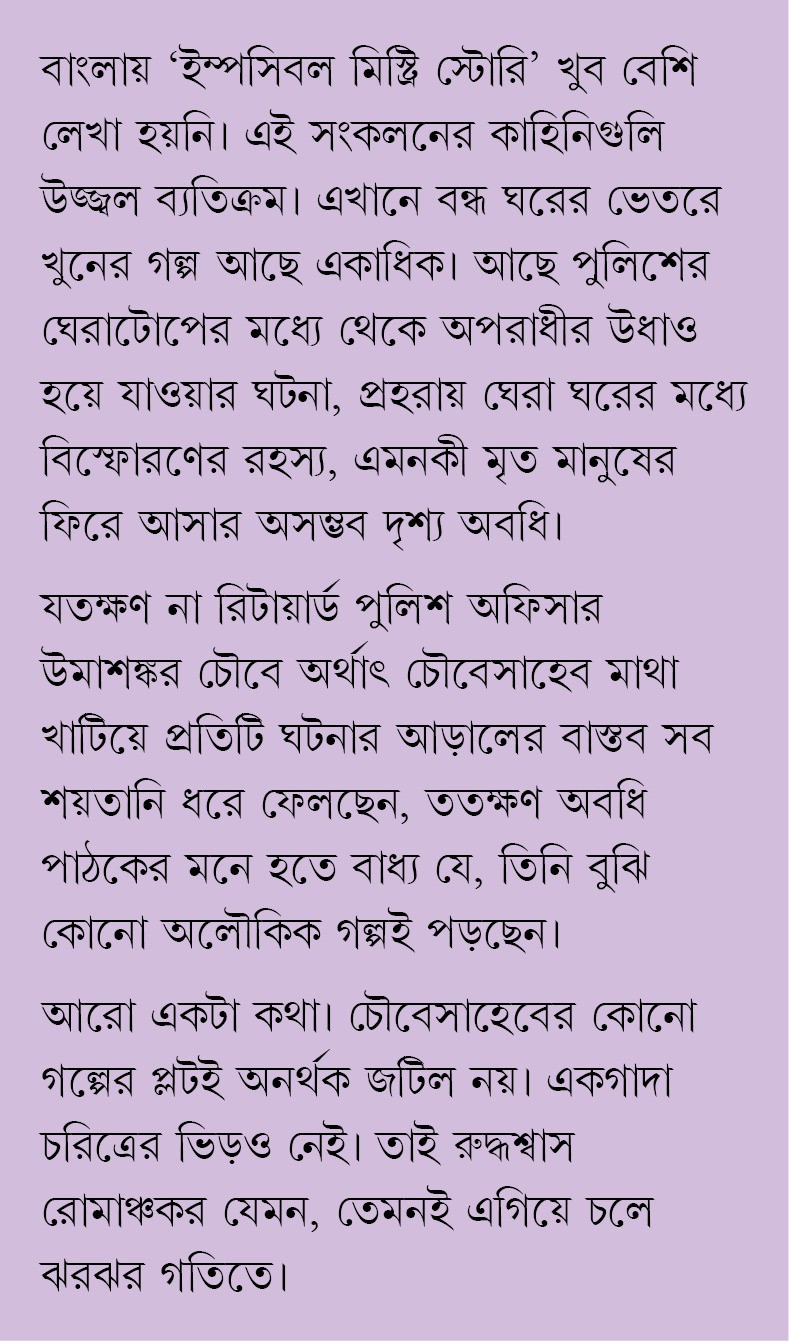 বাংলায় ‘ইম্পসিবল মিস্ট্রি স্টোরি’ খুব বেশি লেখা হয়নি। এই সংকলনের কাহিনিগুলি উজ্জ্বল ব্যতিক্রম। এখানে বন্ধ ঘরের ভেতরে খুনের গল্প আছে একাধিক। আছে পুলিশের ঘেরাটোপের মধ্যে থেকে অপরাধীর উধাও হয়ে যাওয়ার ঘটনা, প্রহরায় ঘেরা ঘরের মধ্যে বিস্ফোরণের রহস্য, এমনকী মৃত মানুষের ফিরে আসার অসম্ভব দৃশ্য অবধি।
