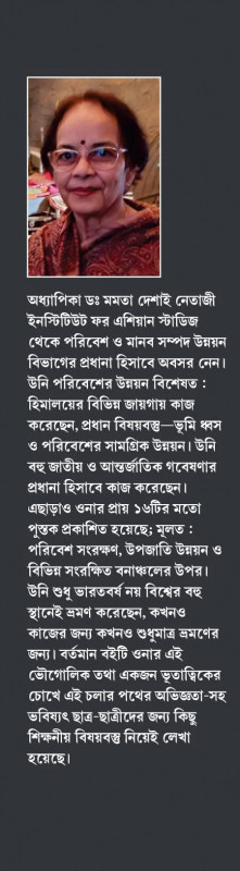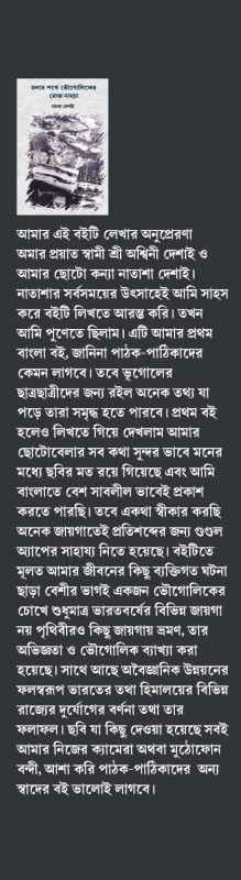 আমার এই বইটি লেখার অনুপ্রেরণা অমার প্রয়াত স্বামী শ্রী অশ্বিনী দেশাই ও আমার ছোটো কন্যা নাতাশা দেশাই। নাতাশার সর্বসময়ের উৎসাহেই আমি সাহস করে বইটি লিখতে আরম্ভ করি। তখন আমি পুণেতে ছিলাম। এটি আমার প্রথম বাংলা বই, জানিনা পাঠক-পাঠিকাদের কেমন লাগবে। তবে ভূগোলের ছাত্রছাত্রীদের জন্য রইল অনেক তথ্য যা পড়ে তারা সমৃদ্ধ হতে পারবে। প্রথম বই হলেও লিখতে গিয়ে দেখলাম আমার ছোটোবেলার সব কথা সুন্দর ভাবে মনের মধ্যে ছবির মত রয়ে গিয়েছে এবং আমি বাংলাতে বেশ সাবলীল ভাবেই প্রকাশ করতে পারছি। তবে একথা স্বীকার করছি অনেক জায়গাতেই প্রতিশব্দের জন্য গুগুল অ্যাপের সাহায্য নিতে হয়েছে। বইটিতে মূলত আমার জীবনের কিছু ব্যক্তিগত ঘটনা ছাড়া বেশীর ভাগই একজন ভৌগোলিকের চোখে শুধুমাত্র ভারতবর্ষের বিভিন্ন জায়গা নয় পৃথিবীরও কিছু জায়গায় ভ্রমণ, তার অভিজ্ঞতা ও ভৌগোলিক ব্যাখ্যা করা হয়েছে। সাথে আছে অবৈজ্ঞানিক উন্নয়নের ফলস্বরূপ ভারতের তথা হিমালয়ের বিভিন্ন রাজ্যের দুর্যোগের বর্ণনা তথা তার ফলাফল। ছবি যা কিছু দেওয়া হয়েছে সবই আমার নিজের ক্যামেরা অথবা মুঠোফোন বন্দী, আশা করি পাঠক-পাঠিকাদের অন্য স্বাদের বই ভালোই লাগবে।