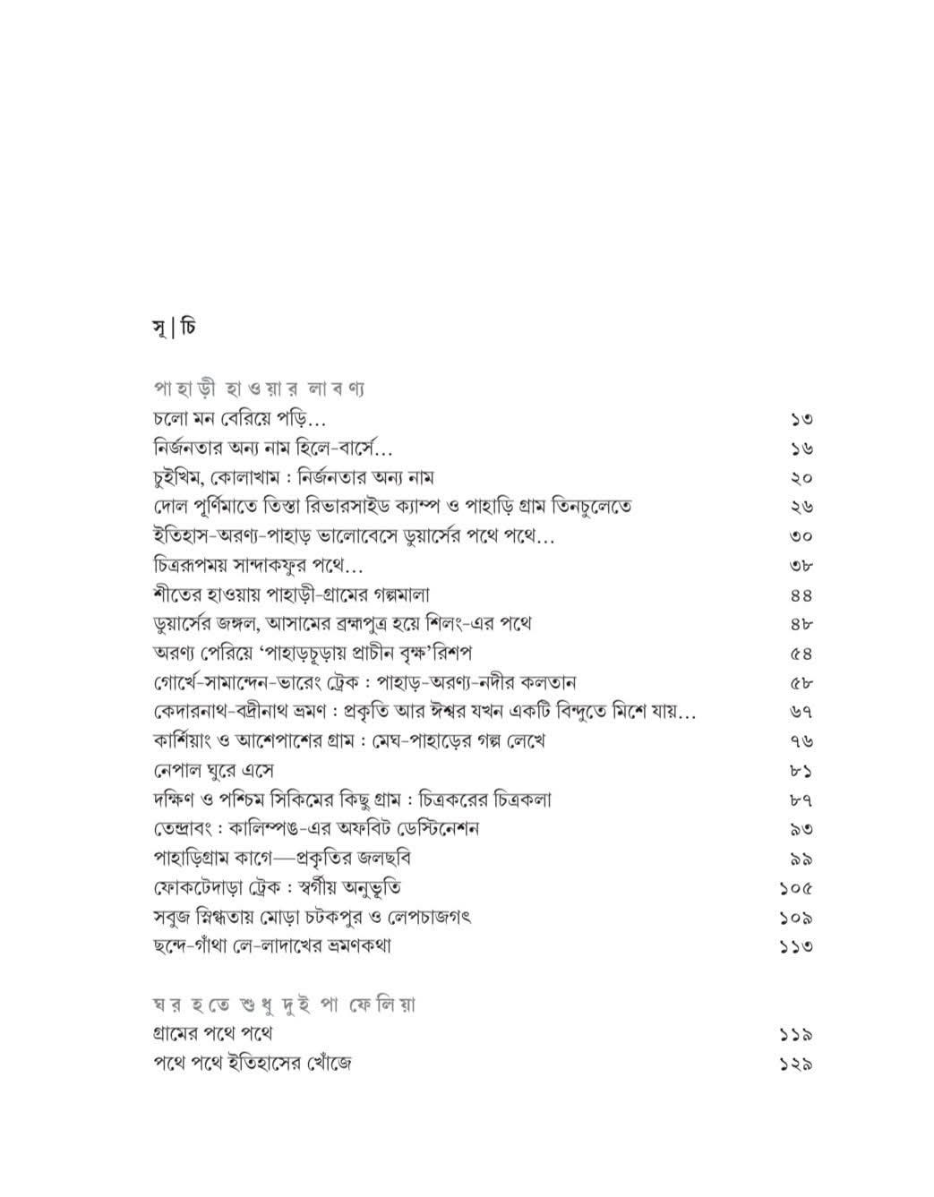 হিমালয়ের নির্জন গ্রাম থেকে ডুয়ার্সের সবুজ জঙ্গল, শান্তিনিকেতনের উৎসব থেকে মন্দারমণির শান্ত সৈকত-এই বই ভ্রমণ, প্রকৃতি, ইতিহাস ও সংস্কৃতির এক অনন্য সংকলন। সান্দাকফুর নীরবতা, কেদারনাথের আধ্যাত্মিক ছোঁয়া, কালিম্পঙ ও পুরুলিয়ার গোপন রত্ন-সব কিছু মিলেই গড়ে উঠেছে এক হৃদয়ছোঁয়া যাত্রাপথ। ব্যক্তিগত অভিজ্ঞতা আর কবিতাময় ভাষায় লেখা এই ভ্রমণপথে পাঠক হেঁটে যাবেন পাহাড়, নদী, অরণ্য আর ইতিহাসের পথে, যেখানে প্রতিটি মোড়ে অপেক্ষা করে আত্মা ও মাটির গভীর সংযোগ। লেখক ঘুরেছেন শুধু স্থান নয়, সময় আর স্মৃতির ভেতর দিয়ে। নদী আর পাহাড়, ইতিহাস আর মানুষ, বন আর উৎসব-সব মিলিয়ে এ এক চিরকালীন সংলাপ প্রকৃতির সঙ্গে। আসামের ব্রহ্মপুত্র থেকে ত্রিপুরার মন্দির, নেপালের ট্রেকিং-পথ থেকে রাজস্থানের মরুভূমি-সব কিছুর ভেতর দিয়ে লেখক রচনা করেছেন স্বপ্নময় দেশচিত্র। লেখকের কলমে ফুটে উঠেছে প্রকৃতি ও মানুষের নিরবধি সম্পর্ক, যেখানে প্রতিটি যাত্রা এক নতুন উপলব্ধির সেতুবন্ধন। এই ভ্রমণপাঠ শুধুই না দেখার গল্প নয়-এ এক গভীরভাবে অনুভব করার আহ্বান।