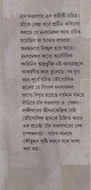 বহু যুগ আগে রচিত 'মনসামঙ্গল কাব্য'এ বিবৃত চাঁদ সওদাগর ও বেহুলা লক্ষ্মীন্দরের জীবনকেন্দ্রিক সেই ভৌগোলিক স্থানকে চিহ্নিত করার এক প্রচেষ্টা 'চাঁদ সওদাগরের দেশ চম্পকনগর'।