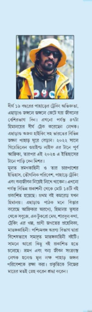 "পূর্ব আফ্রিকার এমবোসেলি ন্যাশনাল পার্ক তথা মাউন্ট কিলিমাঞ্জারো পাদদেশে ক্যাম্প করে থাকা এবং সেখানকার বৈচিত্র্যময় দীর্ঘ বর্ণজীবন ও দীর্ঘদিনের ভ্রমণ ডায়েরি ছবিসহ প্রকাশিত হয়েছে এই বইয়ে"...