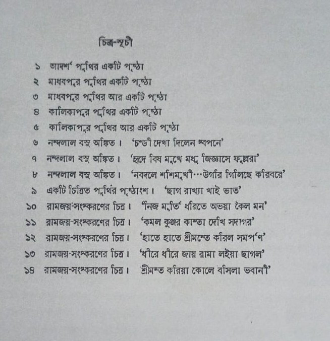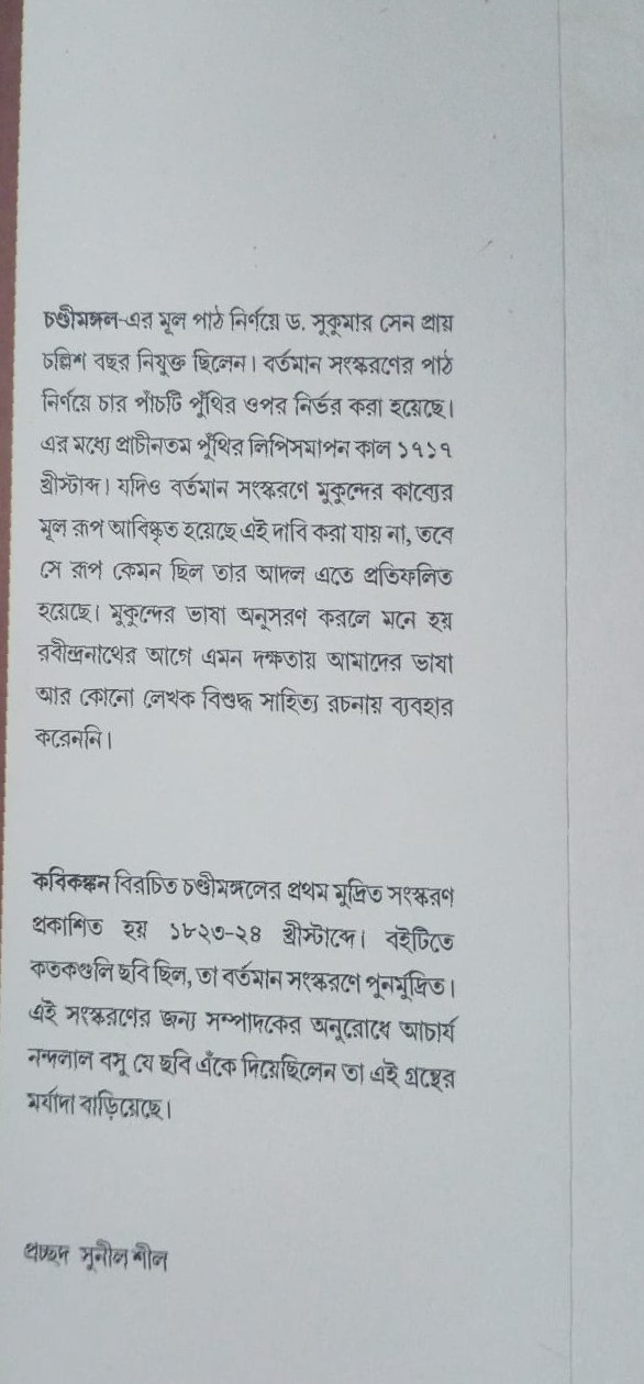 কবিকঙ্কন বিরচিত চণ্ডীমঙ্গলের প্রথম মুদ্রিত সংস্করণ প্রকাশিত হয় ১৮২৩-২৪ খ্রীস্টাব্দে। বইটিতে কতকগুলি ছবি ছিল, তা বর্তমান সংস্করণে পুনর্মুদ্রিত। এই সংস্করণের জন্য সম্পাদকের অনুরোধে আচার্য নন্দলাল বসু যে ছবি এঁকে দিয়েছিলেন তা এই গ্রন্থের মর্যাদা বাড়িয়েছে।