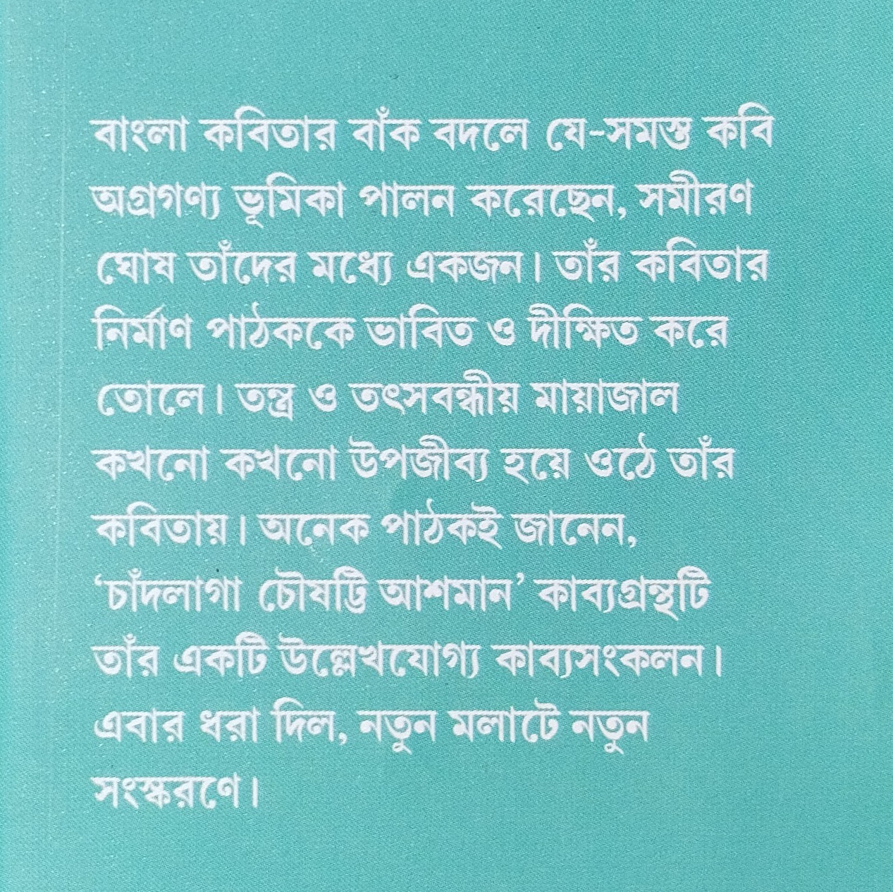 বাংলা কবিতার বাঁক বদলে যে-সমস্ত কবি অগ্রগণ্য ভূমিকা পালন করেছেন, সমীরণ ঘোষ তাঁদের মধ্যে একজন। তাঁর কবিতার নির্মাণ পাঠককে ভাবিত ও দীক্ষিত করে তোলে। তন্ত্র ও তৎসবন্ধীয় মায়াজাল কখনো কখনো উপজীব্য হয়ে ওঠে তাঁর কবিতায়। অনেক পাঠকই জানেন, 'চাঁদলাগা চৌষট্টি আশমান' কাব্যগ্রন্থটি তাঁর একটি উল্লেখযোগ্য কাব্যসংকলন। এবার ধরা দিল, নতুন মলাটে নতুন সংস্করণে।