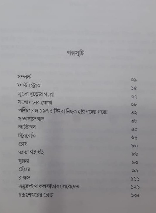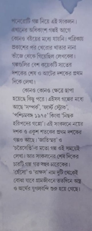 কোনও কোনও ক্ষেত্রে ছাপা হয়েছে কিছু পরে। এইসব গল্পের মধ্যে আছে 'সম্পর্ক', 'ফার্স্ট স্ট্রোক', 'পশ্চিমবঙ্গ ১৯৭৫' কিংবা 'নিছক হরিপদের গপ্পো'। এই সংকলনে নয়ের দশক ও একুশ শতকের প্রথম দশকের গল্পও আছে। 'জাতিস্মর' ও 'চরৈবেতি'-র মতো গল্প ওই সময়েই লেখা। আর সংকলনের শেষ দিকের চারটি গল্প গত বছর চারেকের। 'হেঁসো' ও 'রাক্ষস' নাম দুটি থেকেই বোঝা যাবে গ্রামজীবনে ততদিনে অস্ত্র ও অর্থের যুগলবন্দি শুরু হয়ে গেছে।