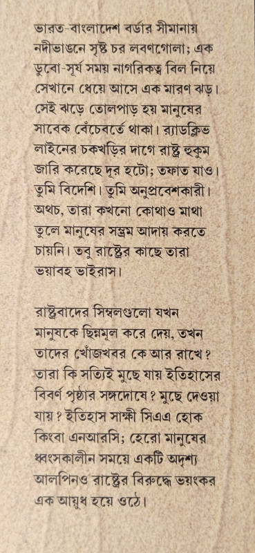 ভারত-বাংলাদেশ বর্ডার সীমানায় নদীভাঙনে সৃষ্ট চর লবণগোলা; এক ডুবো-সূর্য সময় নাগরিকত্ব বিল নিয়ে সেখানে ধেয়ে আসে এক মারণ ঝড়। সেই ঝড়ে তোলপাড় হয় মানুষের সাবেক বেঁচেবর্তে থাকা। র্যাডক্লিভলাইনের চকখড়ির দাগে রাষ্ট্র হুকুম জারি করেছে দূর হটো; তফাত যাও। তুমি বিদেশি। তুমি অনুপ্রবেশকারী। অথচ, তারা কখনো কোথাও মাথা তুলে মানুষের সম্ভ্রম আদায় করতে চায়নি। তবু রাষ্ট্রের কাছে তারা ভয়াবহ ভাইরাস।