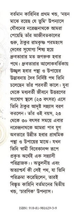 ধ্রুবতারার আলোকবর্তিকায় উজ্জ্বল হবার পন্থা ও উপায়ের উদ্ভাবনায় দৈব নির্দিষ্ট পথ তিনি চলেছেন তাঁর পরবর্তী কালে। যুবা থেকে মধ্যবর্তী জীবনে উত্তরণের সংযোগ স্থলে (২৩ বৎসর) এসে তিনি ঠাকুর আদৃষ্ট সন্ন্যাস বরণ করলেন। তাঁর ওই বয়স, ২৩ থেকে ৩০ বৎসর সময়ে এবার নরেন্দ্রনাথকে আমরা পাব যুগ অবতারে উন্নীত হবার প্রাথমিক পন্থা ও উপায়ের মাঝে। যখন তিনি স্বামী বিবেকানন্দ রূপে প্রকৃত অর্থেই এক সন্ন্যাসী পরিব্রাজক। অতুলনীয় এবং অত্যাশ্চর্য কী সেই পথ, যা তিনি পরিক্রমা করেছিলেন, তারই বিস্তৃত কাহিনি বর্তমানের দ্বিতীয় খন্ড, 'চারণিক' উপন্যাস।