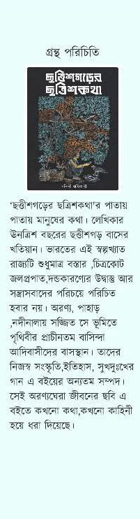 'ছত্তীশগড়ের ছত্রিশকথা'র পাতায় পাতায় মানুষের কথা। লেখিকার ঊনত্রিশ বছরের ছত্তীশগড় বাসের খতিয়ান। ভারতের এই স্বল্পখ্যাত রাজ্যটি শুধুমাত্র বস্তার, চিত্রকোট জলপ্রপাত, দন্ডকারণ্যের উদ্বাস্তু আর সন্ত্রাসবাদের পরিচয়ে পরিচিত হবার নয়। অরণ্য, পাহাড় নদীনালায় সজ্জিত সে ভূমিতে পৃথিবীর প্রাচীনতম বাসিন্দা আদিবাসীদের বাসস্থান। তাদের নিজস্ব সংস্কৃতি, ইতিহাস, সুখদুঃখের গান এ বইয়ের অন্যতম সম্পদ। সেই অরণ্যঘেরা জীবনের ছবি এ বইতে কখনো কথা, কখনো কাহিনী হয়ে ধরা দিয়েছে।