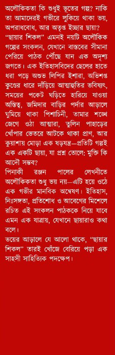 পিনাকী রঞ্জন পালের লেখনীতে অলৌকিকতা শুধু ভয় নয়-এটি হয়ে ওঠে এক গভীর মানবিক অন্বেষণ। ইতিহাস, নিঃসঙ্গতা, প্রতিশোধ ও আবেগের মিশেলে রচিত এই সংকলন পাঠককে নিয়ে যাবে এমন এক যাত্রায়, যেখানে ছায়ারাও কথা বলে।