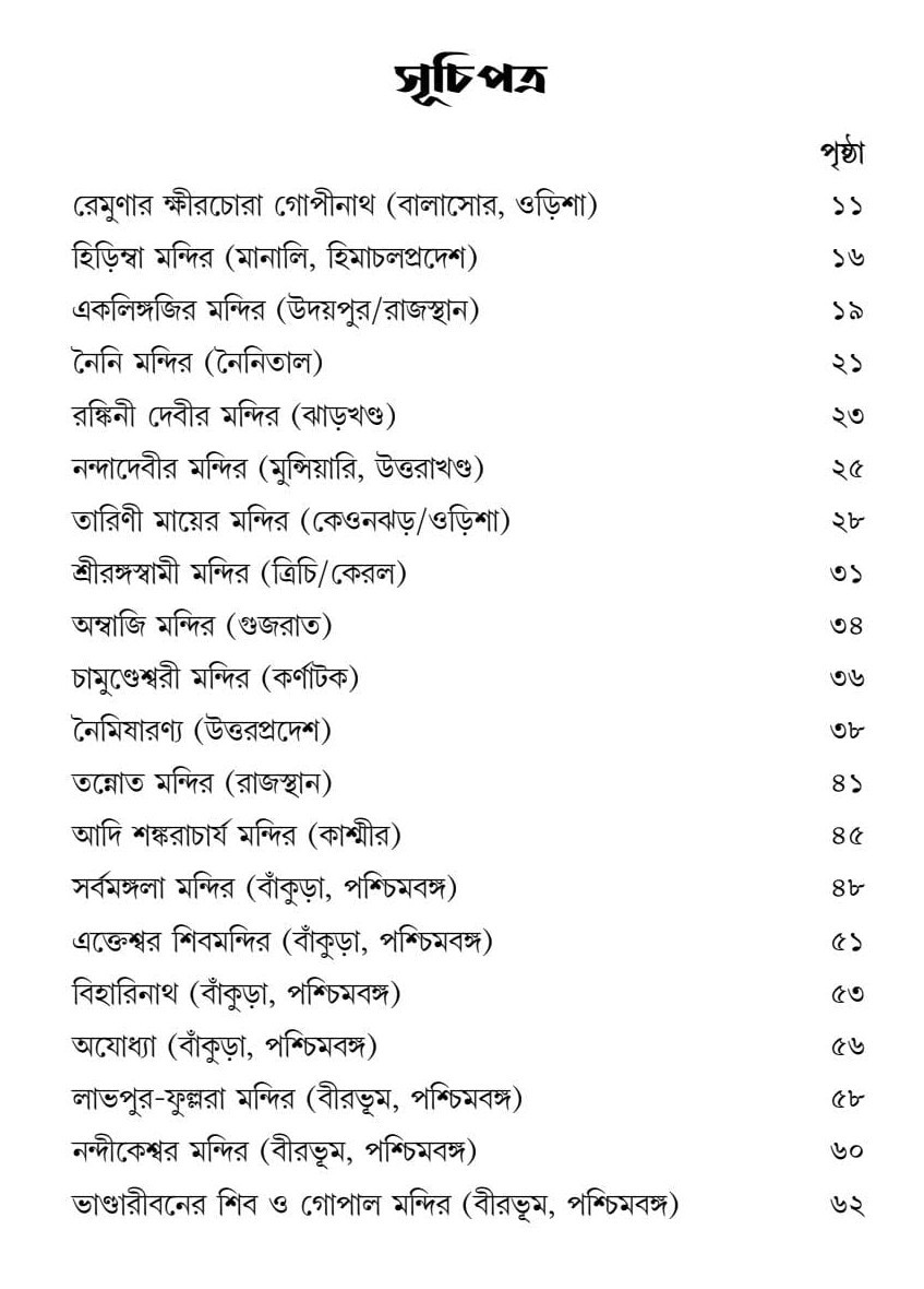 মন্দিরময় এই ভারতভূমির অলিতে গলিতে রয়েছে কতই না মন্দির। তাদের মধ্যে বেশ কিছু মন্দির আছে যেগুলো যথেষ্ট আলোচিত এবং জনপ্রিয়। শুধু ভারতেই নয়, বিশ্বের বিভিন্ন প্রান্তের হিন্দু সম্প্রদায়ের মানুষেরা এই মন্দিরগুলি সম্পর্কে জানেন এবং মানেন। এমন কিছু মন্দির আছে, যেগুলো হয়তোবা ওইসব মন্দিরের তুলনায় কমই চর্চিত হয়, কিন্তু ঐতিহাসিক গুরুত্ব, ধর্মিয় কারণ বা স্থাপত্যশৈলীর নিরীখে এই মন্দিরগুলির গুরুত্বও কিছু কম নয়। এই বইটিতে সেই রকমই কিছু মন্দিরের কথা তুলে ধরার একটি ক্ষুদ্র প্রয়াস চালানো হয়েছে।