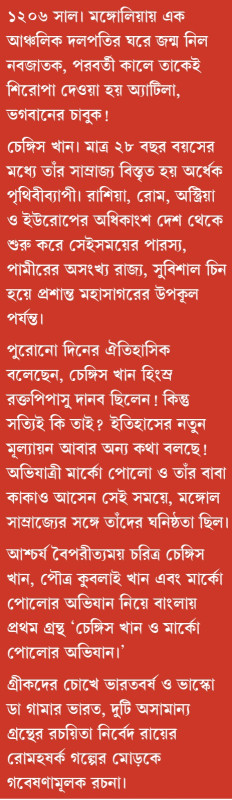 আশ্চর্য বৈপরীত্যময় চরিত্র চেঙ্গিস খান, পৌত্র কুবলাই খান এবং মার্কো পোলোর অভিযান নিয়ে বাংলায় প্রথম গ্রন্থ 'চেঙ্গিস খান ও মার্কো পোলোর অভিযান।' গ্রীকদের চোখে ভারতবর্ষ ও ভাস্কো ডা গামার ভারত, দুটি অসামান্য গ্রন্থের রচয়িতা নির্বেদ রায়ের রোমহর্ষক গল্পের মোড়কে গবেষণামূলক রচনা।