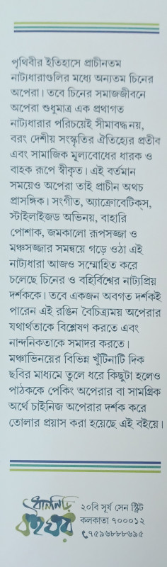 পৃথিবীর ইতিহাসে প্রাচীনতম নাট্যধারাগুলির মধ্যে অন্যতম চিনের অপেরা৷ তবে চিনের সমাজ জীবনে অপেরা শুধুমাত্র এক প্রথাগত নাট্যধারার পরিচয়েই সীমাবদ্ধ নয়, বরং দেশীয় সংস্কৃতির ঐতিহ্যের প্রতীক এবং সামাজিক মূল্যবোধের ধারক ও বাহক রূপে স্বীকৃত৷ এই বর্তমান সময়েও অপেরা তাই প্রাচীন অথচ প্রাসঙ্গিক৷ সংগীত, অ্যাক্রোবেটিক্স, স্টাইলাইজড অভিনয়, বাহারি পোশাক, জমকালো রূপসজ্জা ও মঞ্চসজ্জার সমন্বয়ে গডে ওঠা এই নাট্যধারা আজও সম্মোহিত করে চলেছে চিনের ও বহির্বিশ্বের নাট্যপ্রিয় দর্শককে৷ তবে একজন অবগত দর্শকই পারেন এই রঙিন বৈচিত্র্যময় অপেরার যথার্থতাকে বিশ্লেষণ করতে এবং নান্দনিকতাকে সমাদর করতে৷ মঞ্চাভিনয়ের বিভিন্ন খুঁটিনাটি দিক ছবির মাধ্যমে তুলে ধরে কিছুটা হলেও পাঠককে পেকিং অপেরার বা সামগ্রিক অর্থে চাইনিজ অপেরার দর্শক করে তোলার প্রয়াস করা হয়েছে এই বইয়ে৷