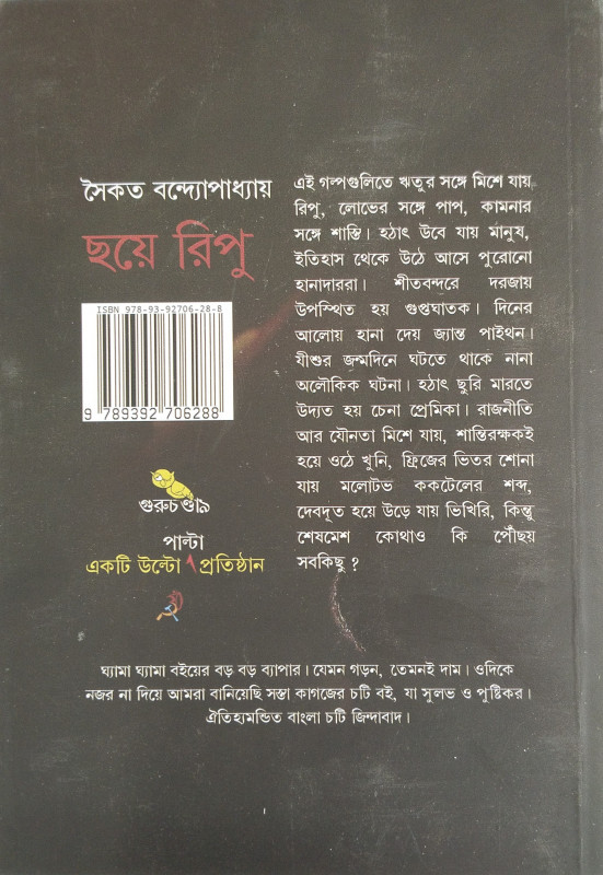 এই গল্পগুলিতে ঋতুর সঙ্গে মিশে যায়। রিপু, লোভের সঙ্গে পাপ, কামনার সঙ্গে শাস্তি। হঠাৎ উবে যায় মানুষ, ইতিহাস থেকে উঠে আসে পুরোনো হানাদাররা। শীতবন্দরে দরজায় উপস্থিত হয় গুপ্তঘাতক। দিনের আলোয় হানা দেয় জ্যান্ত পাইথন। যীশুর জন্মদিনে ঘটতে থাকে নানা অলৌকিক ঘটনা। হঠাৎ ছুরি মারতে উদ্যত হয় চেনা প্রেমিকা। রাজনীতি আর যৌনতা মিশে যায়, শান্তিরক্ষকই হয়ে ওঠে খুনি, ফ্রিজের ভিতর শোনা যায় মলোটভ ককটেলের শব্দ, দেবদূত হয়ে উড়ে যায় ভিখিরি, কিন্তু শেষমেশ কোথাও কি পৌঁছয় সবকিছু?