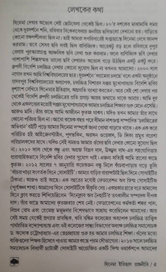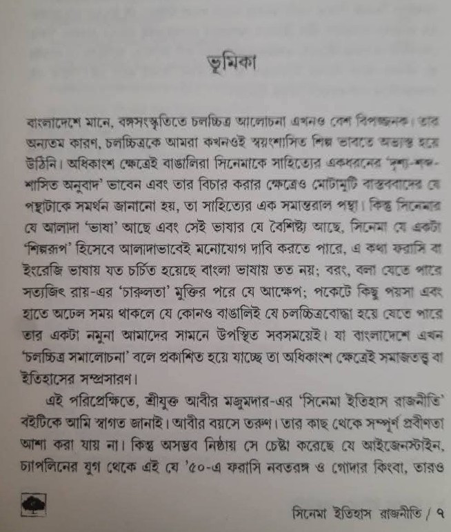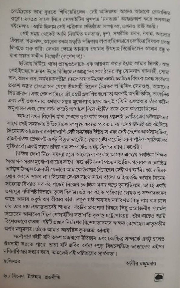 "বাংলায় বিশ্ব চলচ্চিত্রের ইতিহাস নিয়ে এমন কোন বই ছিল না যেখানে বিশ্ব রাজনীতি ও বিশ্ব সমাজের পরিবর্তনের আধারে চলচ্চিত্রের বিবর্তনের ইতিহাস তুলে ধরা হয়েছে।