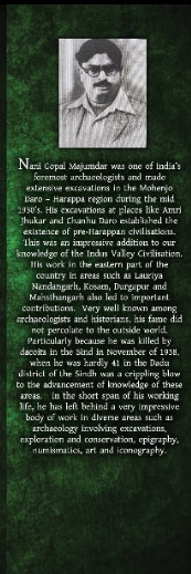 Nani Gopal Majumdar was one of India’s foremost archaeologists and made extensive excavations in the Mohenjo Daro – Harappa region during the mid 1930’s. His excavations at places like Amri Jhukar and Chanhu Daro established the existence of pre-Harappan civilisations. This was an impressive addition to our knowledge of the Indus Valley Civilisation. His work in the eastern part of the country in areas such as Lauriya Nandangarh, Kosam, Durgapur and Mahsthangarh also led to important contributions. Very well known among archaeologists and historians, his fame did not percolate to the outside world. Particularly because he was killed by dacoits in the Sind in November of 1938, when he was hardly 41 in the Dadu district of the Sindh was a crippling blow to the advancement of knowledge of these areas. In the short span of his working life, he has left behind a very impressive body of work in diverse areas such as archaeology involving excavations, exploration and conservation, epigraphy, numismatics, art and iconography.