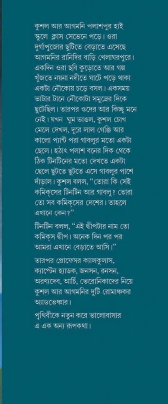 টিনটিন বলল, "এই দ্বীপটার নাম তো কমিক্স দ্বীপ। অনেক দিন পর পর আমরা এখানে বেড়াতে আসি।"
