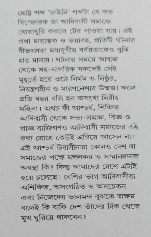 ছোট্ট শব্দ 'ডাইনি' শব্দটা যে কত বিস্ফোরক তা আদিবাসী সমাজে ঘোরাঘুরি করলে টের পাওয়া যায়। এই প্রথা মারাত্মক ও ভয়াবহ, প্রতিটি ঘটনার বীভৎসতা মধ্যযুগীয় বর্বরতাকেও বুঝি হার মানায়। ঘটনার সময়ে আত্মজ থেকে সহ-নাগরিক সকলেই সেই মুহূর্তে হয়ে ওঠে নির্মম ও নিষ্ঠুর, নিয়ন্ত্রণহীন ও মারণনেশায় উন্মত্ত। ফলে প্রতি বছর বলি হন অসংখ্য নিরীহ মহিলা। অথচ কী আশ্চর্য, শিক্ষিত আদিবাসী থেকে সভ্য-সমাজ, বিজ্ঞ ও প্রাজ্ঞ ব্যক্তিগণও আদিবাসী সমাজের এই প্রথা রোধে কেউই এগিয়ে আসেন না। এই আশ্চর্য উদাসীনতা কোনও দেশ বা সমাজের পক্ষে মঙ্গলকর ও সম্মানজনক অবস্থা কি? কিন্তু আমাদের দেশে এটাই হয়ে চলেছে। বেশির ভাগ আদিবাসীরা অশিক্ষিত, অসংগঠিত ও অসচেতন এবং নিজেদের ভালমন্দ বুঝতে অক্ষম বলেই কি বাকি দেশ তাঁদের দিক থেকে মুখ ঘুরিয়ে থাকবেন?
