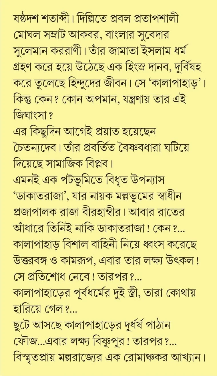 এমনই এক পটভূমিতে বিধৃত উপন্যাস ‘ডাকাতরাজা’, যার নায়ক মল্লভূমের স্বাধীন প্রজাপালক রাজা বীরহাম্বীর ৷ আবার রাতের আঁধারে তিনিই নাকি ডাকাতরাজা ! কেন ?…
