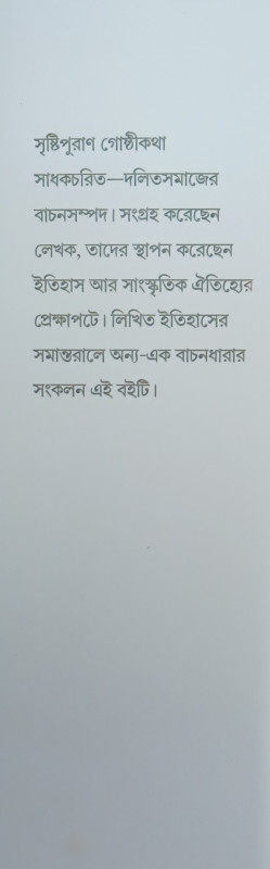 সৃষ্টিপুরাণ গোষ্ঠীকথা সাধকচরিত-দলিতসমাজের বাচনসম্পদ। সংগ্রহ করেছেন লেখক, তাদের স্থাপন করেছেন ইতিহাস আর সাংস্কৃতিক ঐতিহ্যের প্রেক্ষাপটে। লিখিত ইতিহাসের সমান্তরালে অন্য-এক বাচনধারার সংকলন এই বইটি।