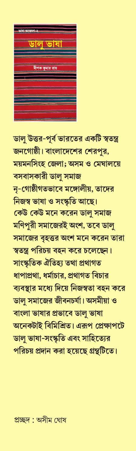 ডালু উত্তর-পূর্ব ভারতের একটি স্বতন্ত্র জনগোষ্ঠী। বাংলাদেশের শেরপুর, ময়মনসিংহ জেলা; অসম ও মেঘালয়ে বসবাসকারী ডালু সমাজ নৃ-গোষ্ঠীগতভাবে মঙ্গোলীয়, তাদের নিজস্ব ভাষা ও সংস্কৃতি আছে। কেউ কেউ মনে করেন ডালু সমাজ মণিপুরী সমাজেরই অংশ, তবে ডালু সমাজের বৃহত্তর অংশ মনে করেন তারা স্বতন্ত্র পরিচয় বহন করে চলেছেন। সাংস্কৃতিক ঐতিহ্য তথা প্রথাগত ধাপাপ্রথা, ধর্মাচার, প্রথাগত বিচার ব্যবস্থার মধ্যে দিয়ে নিজস্বতা বহন করে ডালু সমাজের জীবনচর্যা। অসমীয়া ও বাংলা ভাষার প্রভাবে ডালু ভাষা অনেকটাই বিমিশ্রিত। এরূপ প্রেক্ষাপটে ডালু ভাষা-সংস্কৃতি এবং সাহিত্যের পরিচয় প্রদান করা হয়েছে গ্রন্থটিতে।