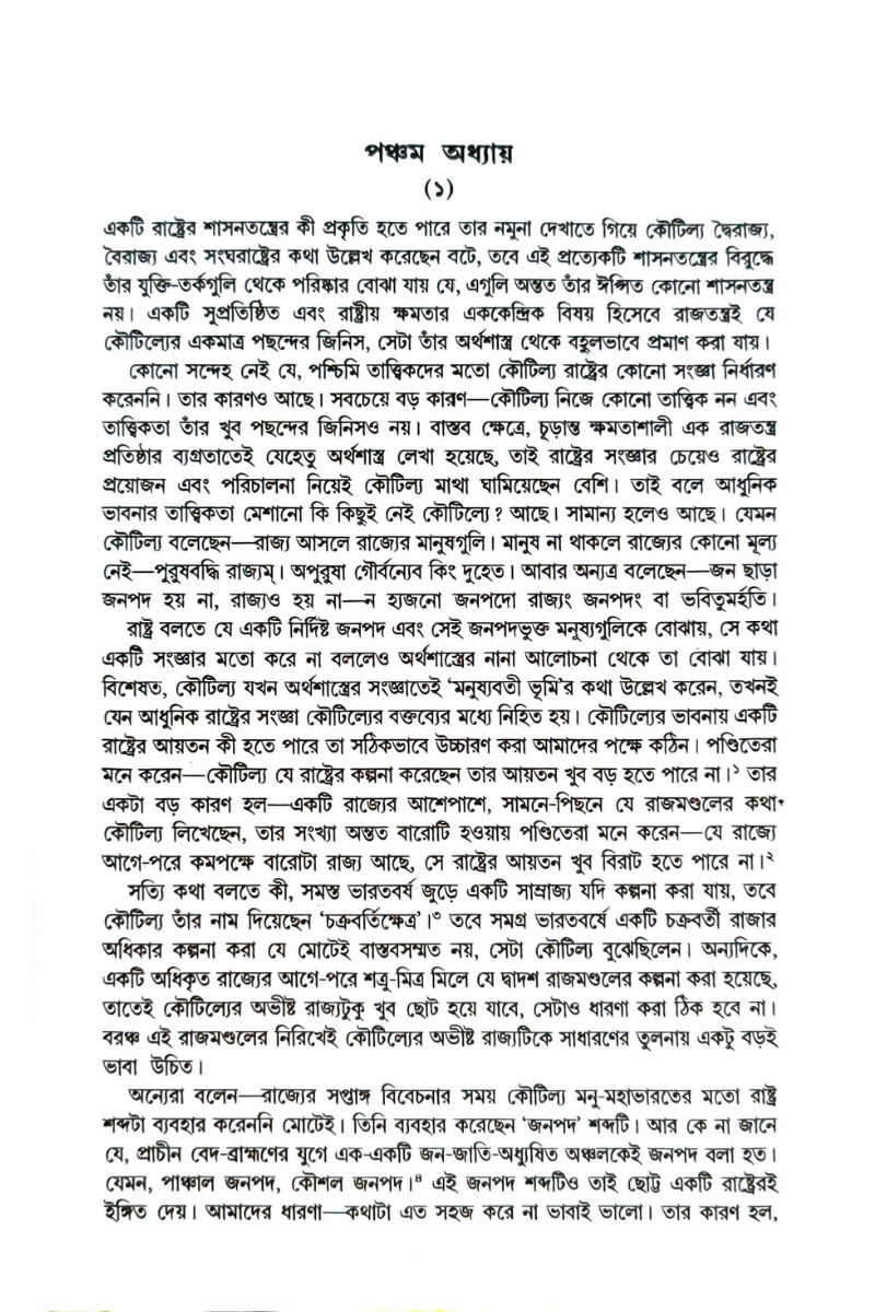 কোনো সন্দেহ নেই যে, পশ্চিমি তাত্ত্বিকদের মতো কৌটিল্য রাষ্ট্রের কোনো সংজ্ঞা নির্ধারণ করেননি। তার কারণও আছে। সবচেয়ে বড় কারণ-কৌটিল্য নিজে কোনো তাত্ত্বিক নন এবং তাত্ত্বিকতা তাঁর খুব পছন্দের জিনিসও নয়। বাস্তব ক্ষেত্রে, চূড়ান্ত ক্ষমতাশালী এক রাজতন্ত্র প্রতিষ্ঠার ব্যগ্রতাতেই যেহেতু অর্থশাস্ত্র লেখা হয়েছে, তাই রাষ্ট্রের সংজ্ঞার চেয়েও রাষ্ট্রের প্রয়োজন এবং পরিচালনা নিয়েই কৌটিল্য মাথা ঘামিয়েছেন বেশি। তাই বলে আধুনিক ভাবনার তাত্ত্বিকতা মেশানো কি কিছুই নেই কৌটিল্যে? আছে। সামান্য হলেও আছে। যেমন কৌটিল্য বলেছেন-রাজ্য আসলে রাজ্যের মানুষগুলি। মানুষ না থাকলে রাজ্যের কোনো মূল্য নেই-পুরুষবদ্ধি রাজ্যম্। অপুরুষা গৌর্বন্যেব কিং দুহেত। আবার অন্যত্র বলেছেন-জন ছাড়া জনপদ হয় না, রাজ্যও হয় না-ন হ্যাজনো জনপদো রাজ্যং জনপদং বা ভবিতুমর্হতি।