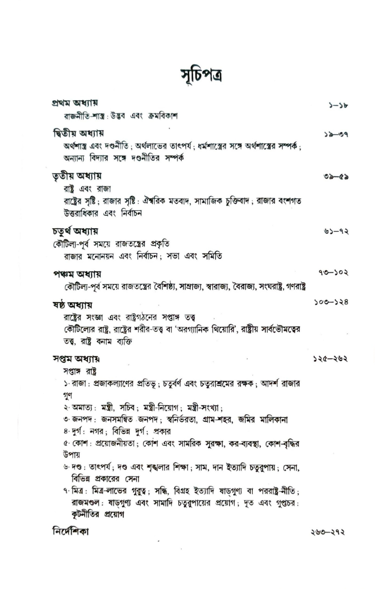 'একটি রাষ্ট্রের শাসনতন্ত্রের কী প্রকৃতি হতে পারে তার নমুনা দেখাতে গিয়ে কৌটিল্য দ্বৈরাজ্য, বৈরাজ্য এবং সংঘরাষ্ট্রের কথা উল্লেখ করেছেন বটে, তবে এই প্রত্যেকটি শাসনতন্ত্রের বিরুদ্ধে তাঁর যুক্তি-তর্কগুলি থেকে পরিষ্কার বোঝা যায় যে, এগুলি অন্তত তাঁর ঈপ্সিত কোনো শাসনতন্ত্র নয়। একটি সুপ্রতিষ্ঠিত এবং রাষ্ট্রীয় ক্ষমতার এককেন্দ্রিক বিষয় হিসেবে রাজতন্ত্রই যে কৌটিল্যের একমাত্র পছন্দের জিনিস, সেটা তাঁর অর্থশাস্ত্র থেকে বহুলভাবে প্রমাণ করা যায়।