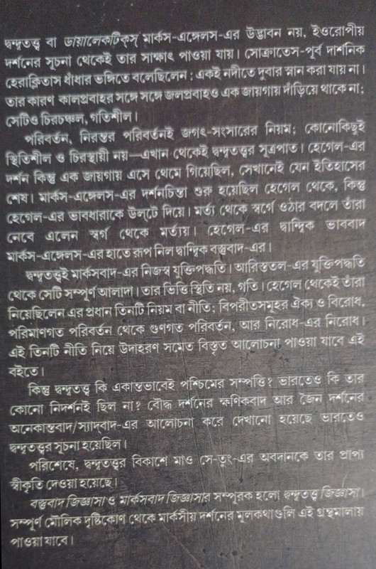 দ্বন্দ্বতত্ত্বই মার্কসবাদ-এর নিজস্ব যুক্তিপদ্ধতি। আরিস্ততল-এর যুক্তিপদ্ধতি থেকে সেটি সম্পূর্ণ আলাদা। তার ভিত্তি স্থিতি নয়, গতি। হেগেল থেকেই তাঁরা নিয়েছিলেন এর প্রধান তিনটি নিয়ম বা নীতি: বিপরীতসমূহর ঐক্য ও বিরোধ, পরিমাণগত পরিবর্তন থেকে গুণগত পরিবর্তন, আর নিরোধ-এর নিরোধ। এই তিনটি নীতি নিয়ে উদাহরণ সমেত বিস্তৃত আলোচনা পাওয়া যাবে এই বইতে।